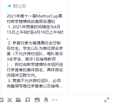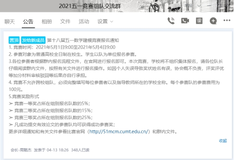 由于五一数学建模是各支队伍自行报名,数学建模协会提前编写了《竞赛报名指南》并发布于竞赛交流群中,极大地方便了各支参赛队伍报名、有效地提高了报名效率、统一解决了各类报名的问题。