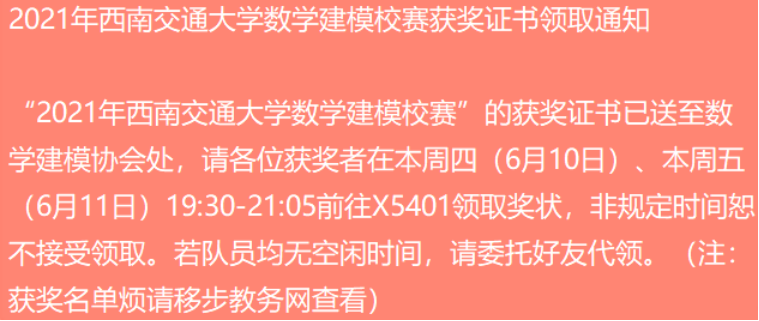 随后,数学建模协会在最短时间内完成了奖状的制作、校对、审核,并交由学校盖章,次日便发布了获奖证书的领取通知。