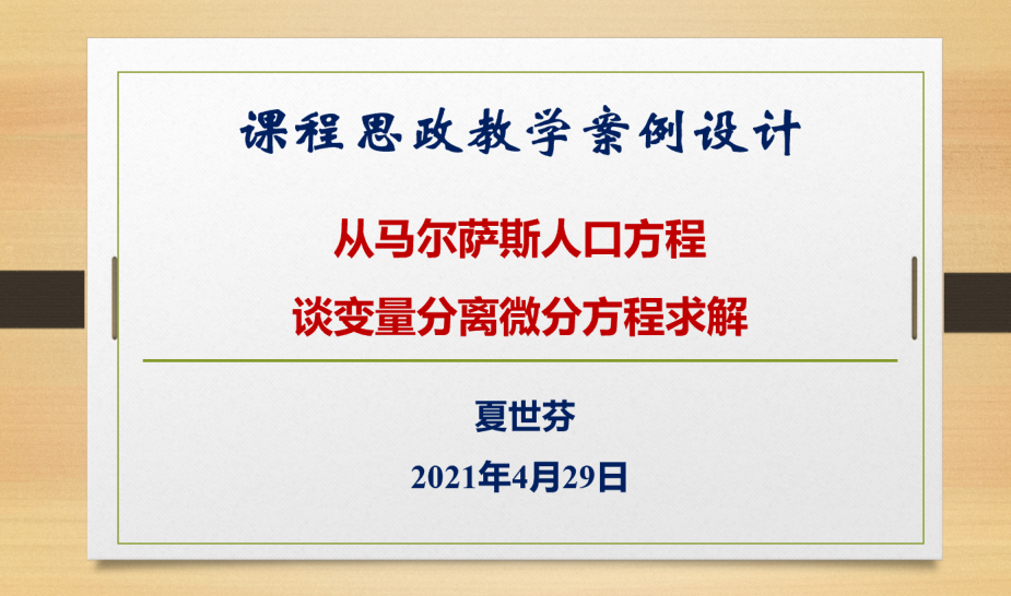 在面向系部全体教师开展的“课程门门有思政,教师人人讲育人”课程思政教学案例设计活动中,经支部推进,专家评审,共评选出10份优秀教学案例,涉及《高等数学》、《线性代数》、《概率论与数理统计》和《数学建模》等公共基础数学课程。党支部邀请了3位教师在线交流分享优秀案例设计的经验。邓绍高老师从数学课程应抓住实际问题背景开展教学为切入点介绍了《多元函数的极值与最值》课程思政教学案例的设计。夏世芬老师聚焦第七次全国人口普查设计了《从马尔萨斯人口方程谈变量分离微分方程求解》的案例,帮助学生正确认识国家的大政方针,增强政治认同。张兴元老师结合自己的教学实践介绍了数学建模课程中《发射卫星为什么用三级火箭》的案例,从中国航天的历史成就和未来任务厚植家国情怀,激发学生为国奋发的责任感和使命感。3位老师的精彩发言也引起了与会老师的热议,大家就课程思政教育中思政素材的选取、课堂教学中的融入与渗透、教学效果的评价等问题展开了交流讨论。最后,支部书记冯颖就党支部以党建引领课程思政工作进行了阶段性小结,在前期开展的理论学习、案例设计、研讨交流等工作基础上,将持续推进课程思政进课堂、进课程,扎实开展协同育人工作以实现党建工作与育人工作互促进、共提高的目标。