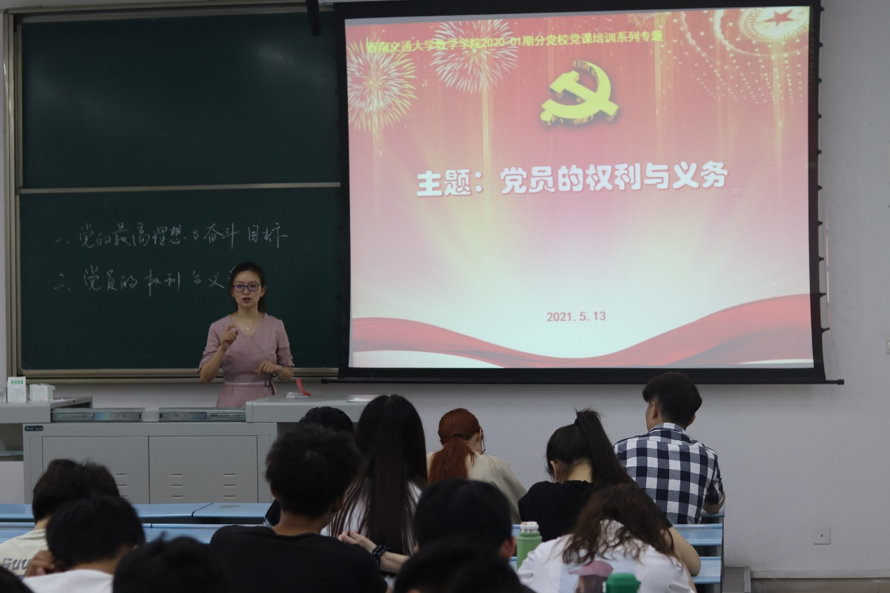 2138cc太阳集团2021-01期入党积极分子培训党课于5月13日下午2:30在X2428举行。本次党课由2138cc太阳集团团委书记邓思然主讲,内容为“党的纲领和奋斗目标”和“党员的权利与义务”。