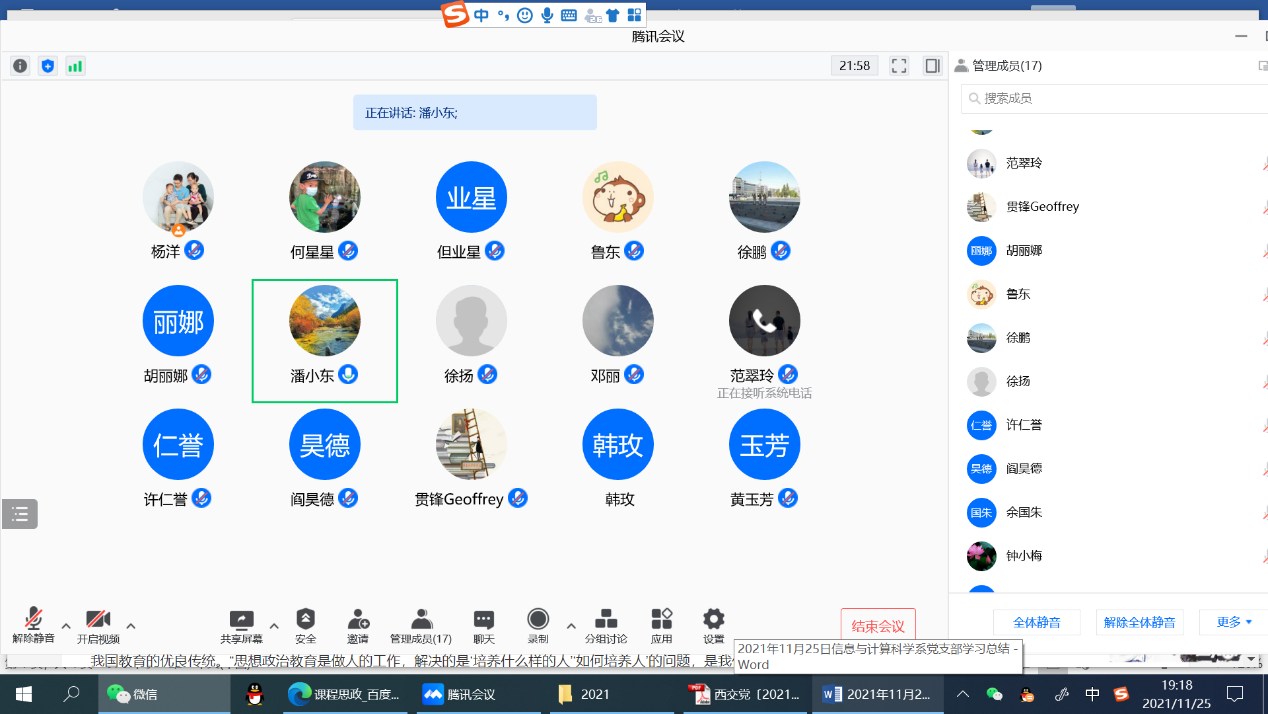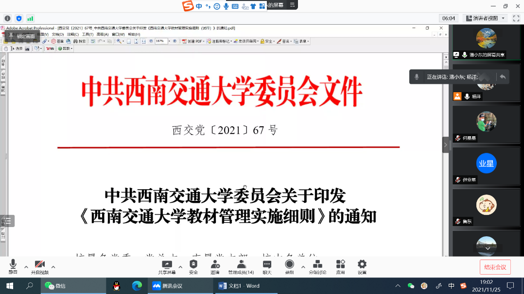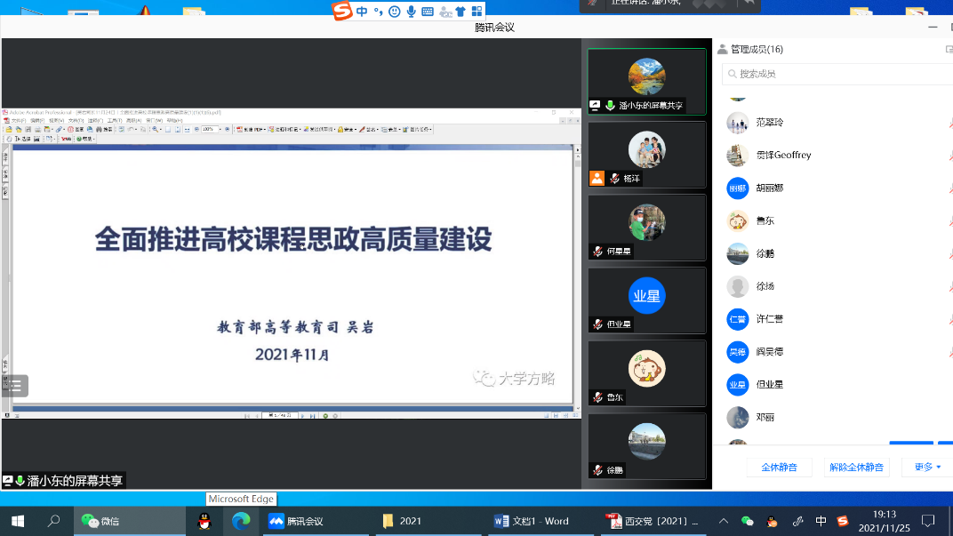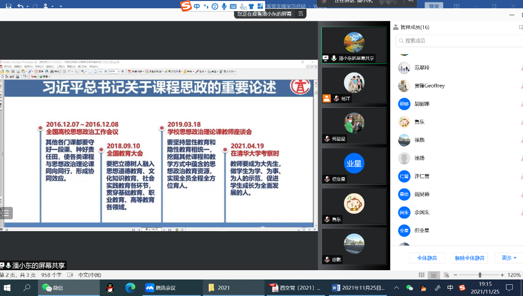 2021年11月25日晚上7:00,2138cc太阳集团信息与计算科学系党支部通过腾讯会议(会议 ID:812-645-493)召开支部学习会议。潘小东副院长给老师们解读了[西交党[2021]67号_中共2138cc太阳集团委员会《关于印发2138cc太阳集团教材管理实施细则试行的通知》]、吴岩司长关于全面推进高校课程思政高质量建设的报告。