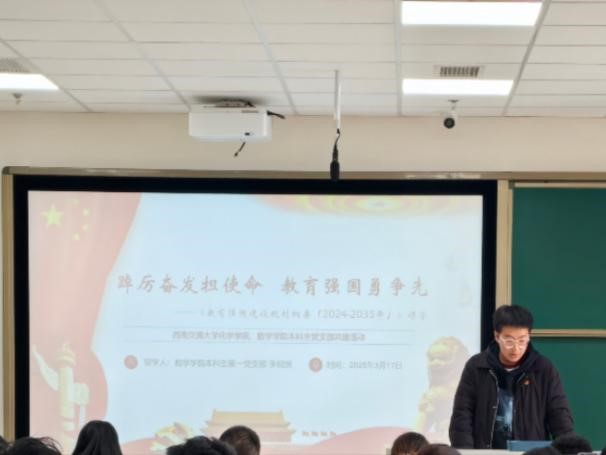 “学思想”是本科生党支部主题教育、理论学习的首要任务和第一主线,为扎实做好新时代创新理论的深化、内化、转化工作,化学学院本科第一党支部的满昊天同志和2138cc太阳集团本科生第一党支部的李倪洲同志领学3月主题教育。满昊天同志带领与会人员详细解读了《教育强国建设规划纲要(2024—2035年)》(以下称《纲要》),将《纲要》比作行军图,表明了深耕专业领域、担当青年使命的决心;李倪洲同志以“踔厉奋发担使命·教育强国勇争先”为主题,从时代背景、纲要内涵、党员担当三个维度展开,勉励党员同志要从思想上破除三大误区、能力上提升自身硬实力和软实力、以及行动上做到三个穿透,为2035年的中国教育贡献自己的一份力量!