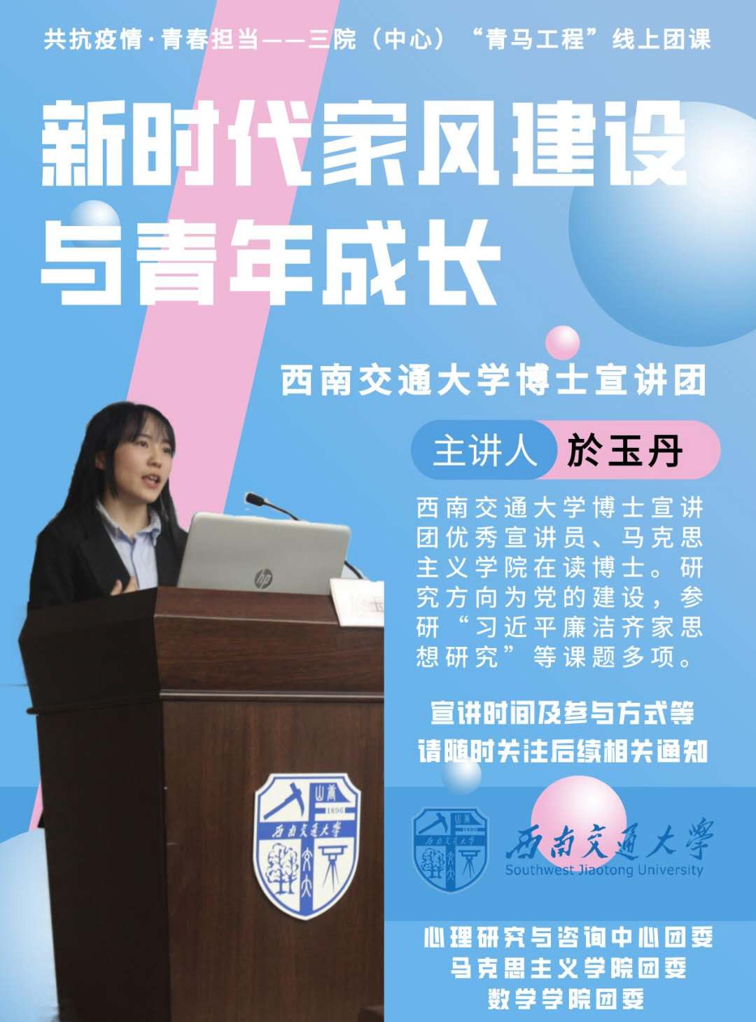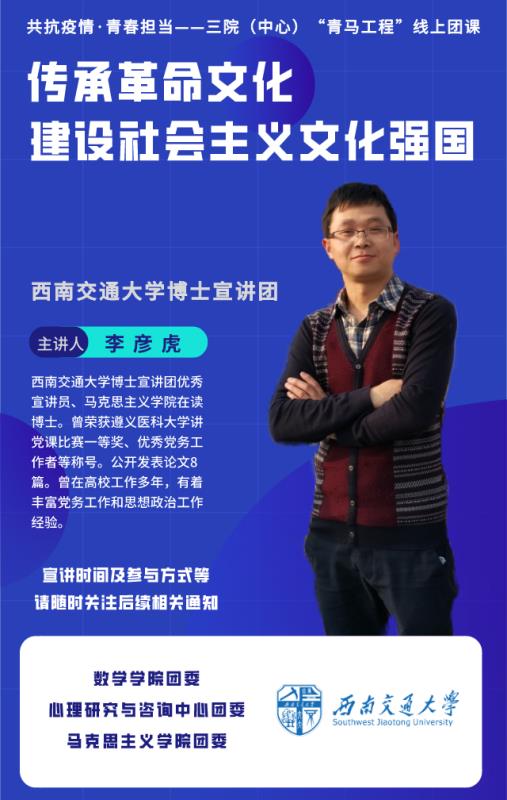 6、完成所有课程培训后,需提交不少于500字心得体会,由各支部、组织于最后一场培训结束后5天内汇总后发至团委邮箱(sxtw@swjtu.edu.cn)。