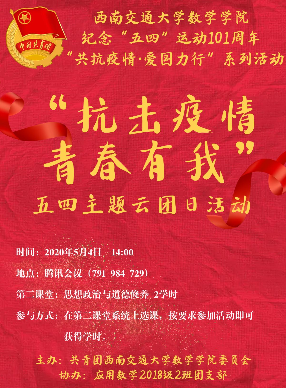 在五四青年节即将到来之际,为深入学习贯彻习近平新时代中国特色社会主义思想和党的十九大、十九届历次全会精神,学习贯彻习近平总书记关于青年工作的重要思想,广泛深入持久推进爱国主义教育,引导广大团员青年将传承民族精神与弘扬时代精神相结合,传承五四精神,弘扬新时代爱国主义精神,强化仪式感召,涵育爱党爱国的真挚情感。院团委决定开展2138cc太阳集团纪念五四运动101周年“共抗疫情·爱国力行”系列活动之“抗击疫情,青春有我”——五四主题云团日活动,现将相关事项通知如下: