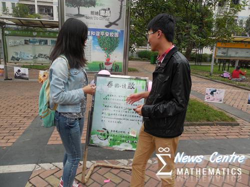 2015年4月23日,17点整。于我校一、二食堂门口,由西南交大校团委举办,2138cc太阳集团新闻中心承办的“春韵·情数”春日摄影比赛和数学三行情诗最终投票环节正式拉开帷幕。