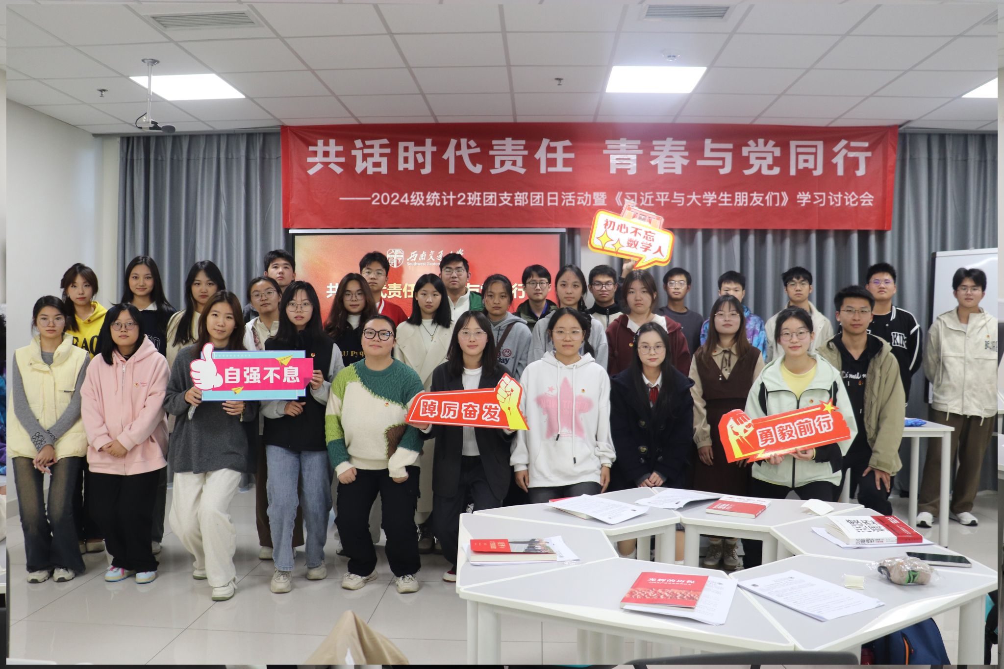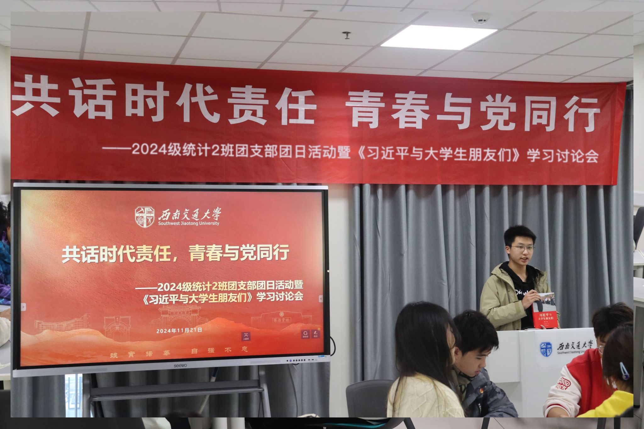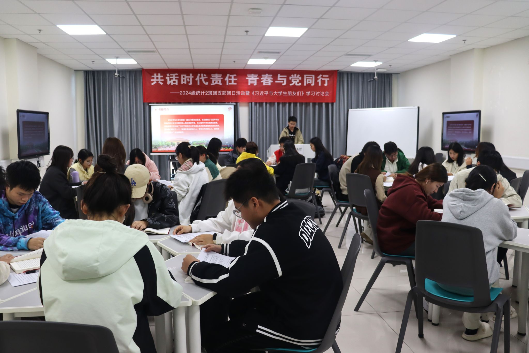 为深入学习贯彻习近平新时代中国特色社会主义思想,2024年11月21日,2138cc太阳集团2024级统计2班团支部“共话时代责任,青春与党同行”主题团日活动暨《习近平与大学生朋友们》学习讨论会在X30384顺利举办。本次活动由团建中心詹延同学主持,30余名师生参加。