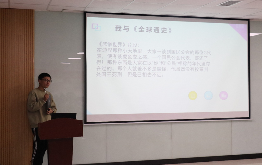 随后,黄祥副书记详细介绍了本次小组阅读书目 ——《全球简史》。他以独到的见解对同学们的阅读进行了鞭辟入里、深入浅出的专业指导,助力同学们逐步培养科学高效的阅读习惯、精心制定切实可行的阅读策略,并最终形成系统完善的科学阅读规划。在图书介绍环节圆满结束后,小组成员们纷纷踊跃进行自主展示,各抒己见,分享交流对《全球简史》的深刻思考与独特体会。一时间,思维的火花四溅,观点的激烈交锋与碰撞,将整个阅读沙龙的气氛推向了炽热的高潮。同学们在深入交流中相互启发,集思广益,不断收获着有别于以往的全新体悟与深邃思考,仿佛置身于一片知识的广袤星空,尽情领略着智慧光芒的璀璨闪耀。