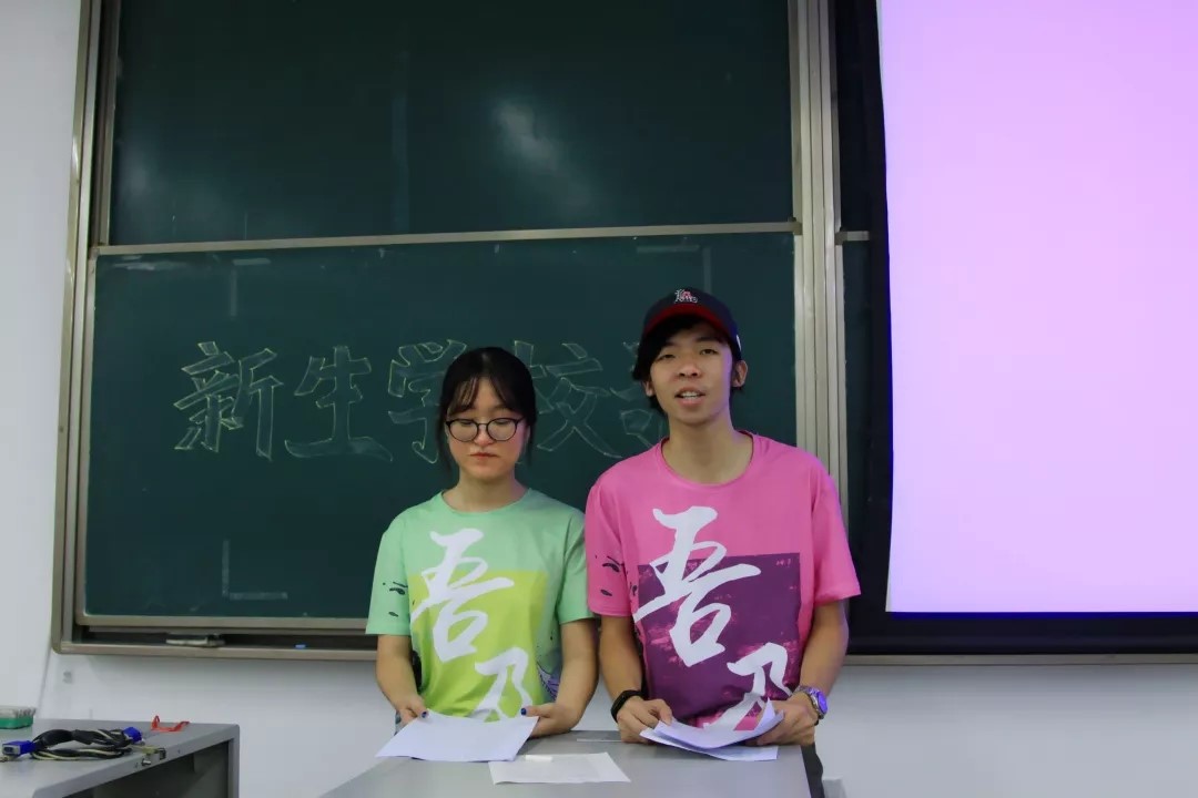 接下来,在钟老师的引导下,便是学习校歌阶段,由17届统计专业胡皓量与17届应数专业闵琮惠同学为18届数院新生教唱校歌。