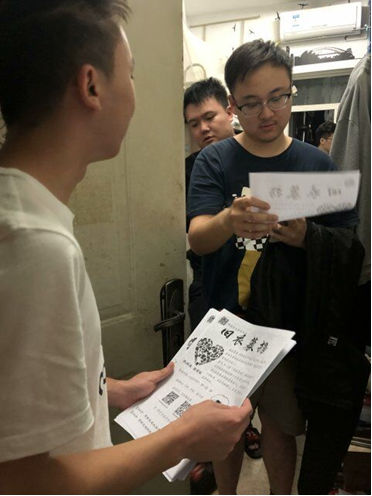 5月22日晚9时30分,旧衣募捐线下宣传活动开始了。数学青协的志愿者们分成几个小组,带着宣传单,在天佑斋宣传旧衣募捐活动。这次旧衣募捐面对的主要对象是即将毕业的大四学生。志愿者在宣传过程中,也解释了这次旧衣募捐的目的:青协将会与成都义工联系,将收来的旧衣捐赠给山区的孩子或是猫狗之家。宣传活动持续到晚11点,这次宣传很顺利,为后面几天的活动奠定了良好基础。