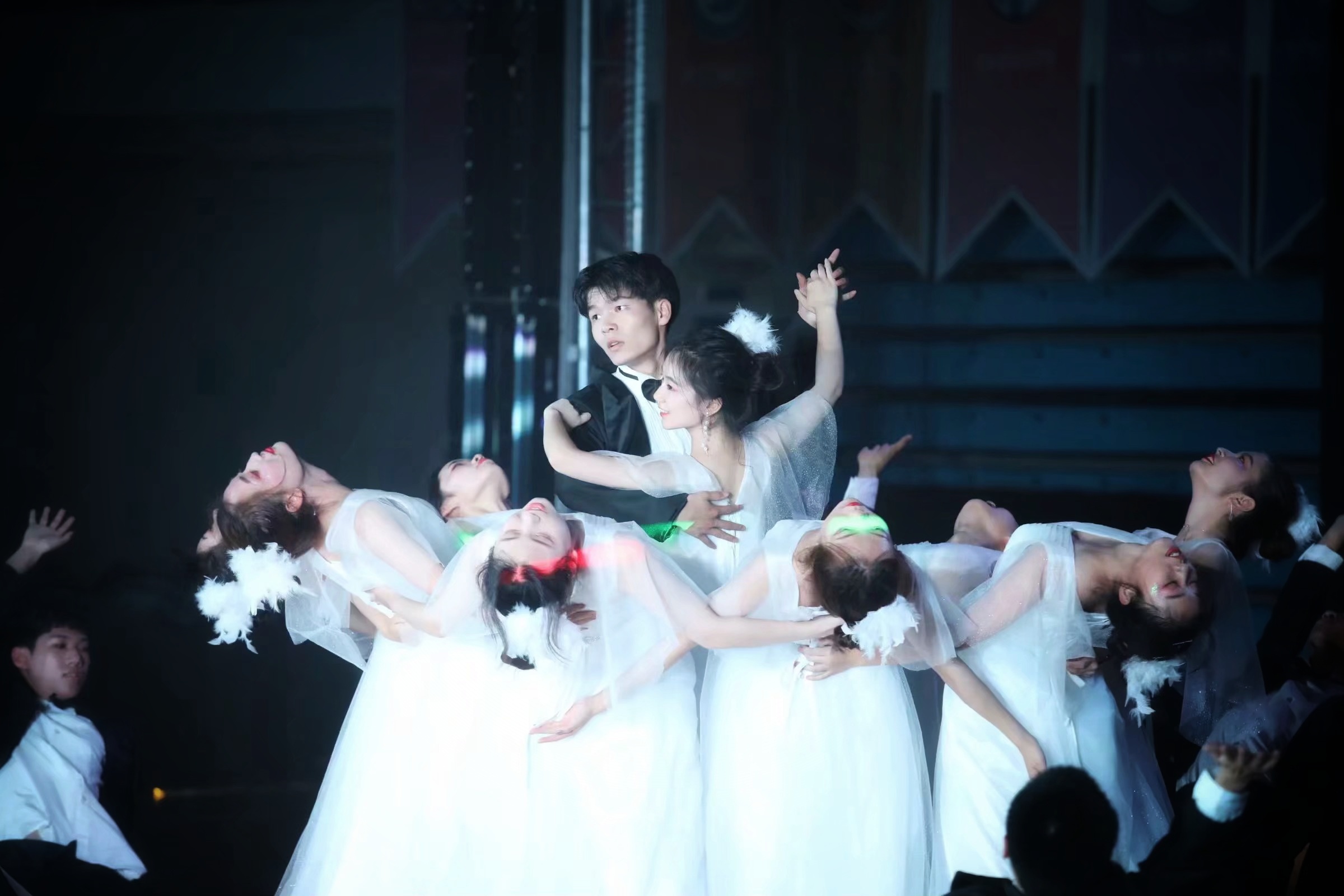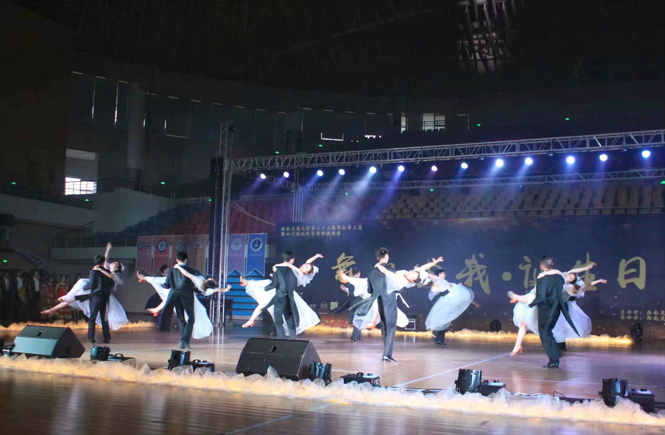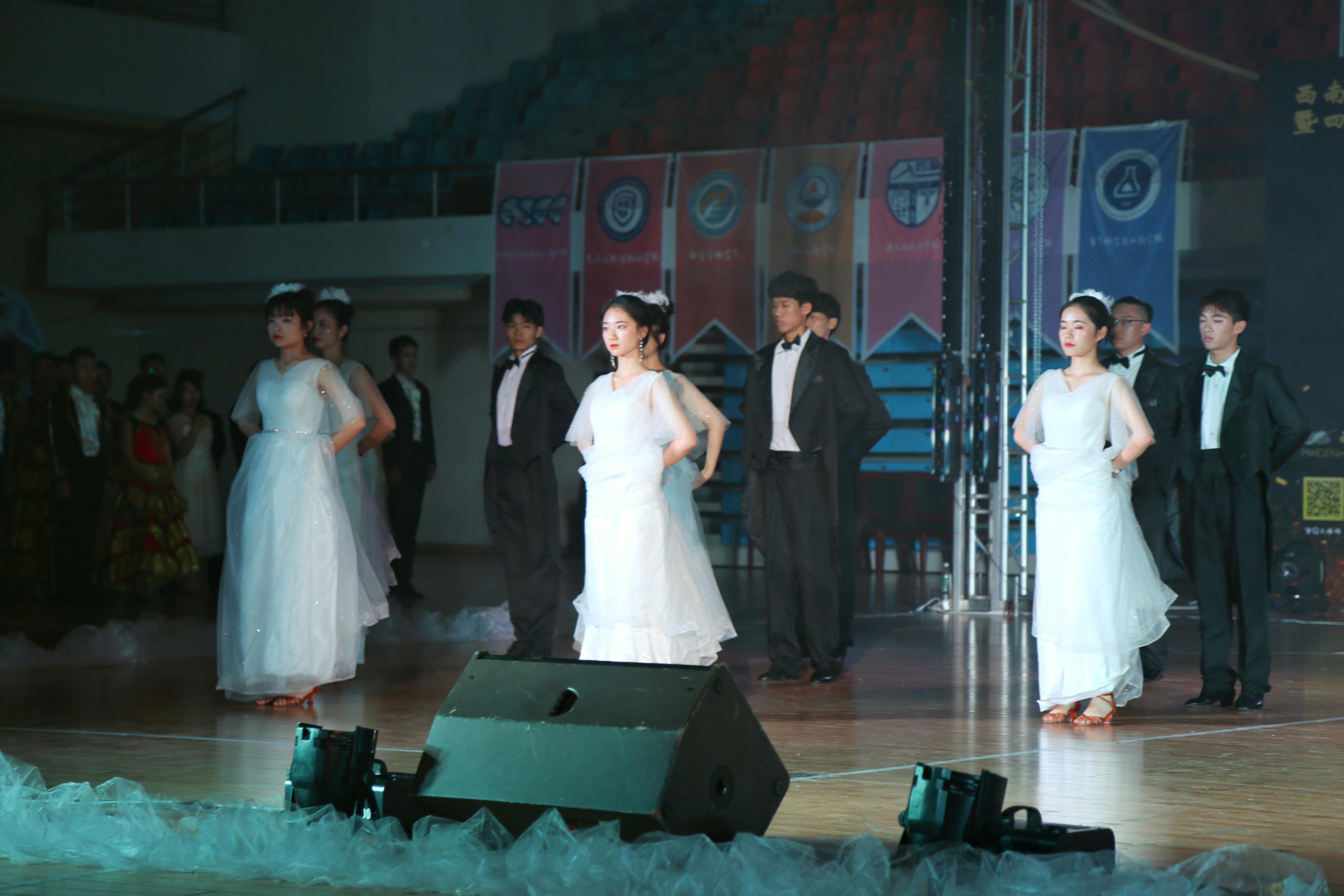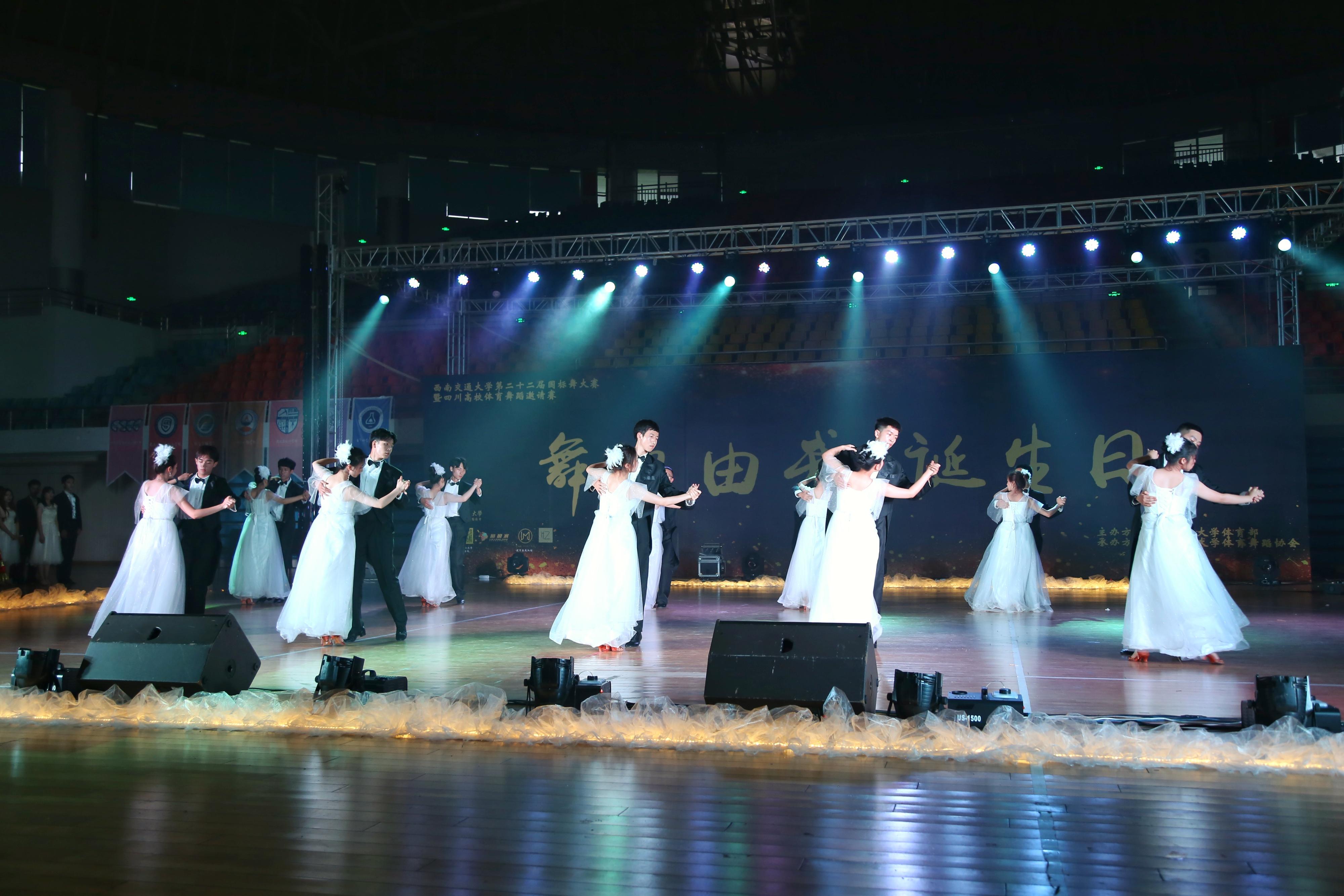 体育舞蹈协会在带来一段精彩绝伦的开场舞后,比赛正式拉开了序幕,艳丽华美的各比赛组有序聚集在舞台灯光下。