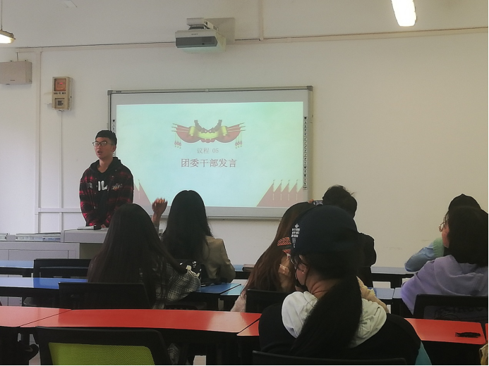 全体起立唱完团歌后,团支书向我们讲解了有关中国共青团的知识,包括共青团的性质、成立时间。我们了解了对青年的定义,意识到了我们共青团员是中国共产党的助手和后备军,了解了共青团在革命时期和当今背景下所具有的不同的职能。此外团支书还介绍了共青团的团旗、团徽,增强了我们对共青团的认识和理解。