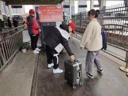 安检组的成员们来到校园直通车的快捷通道。许多住成都市里,在周边县镇上学的学生每周天都从这里返回学校。志愿者们帮助同学们搬运行李,监督行李安检,并劝导非指定学校学生的乘客从其它安检口进站。