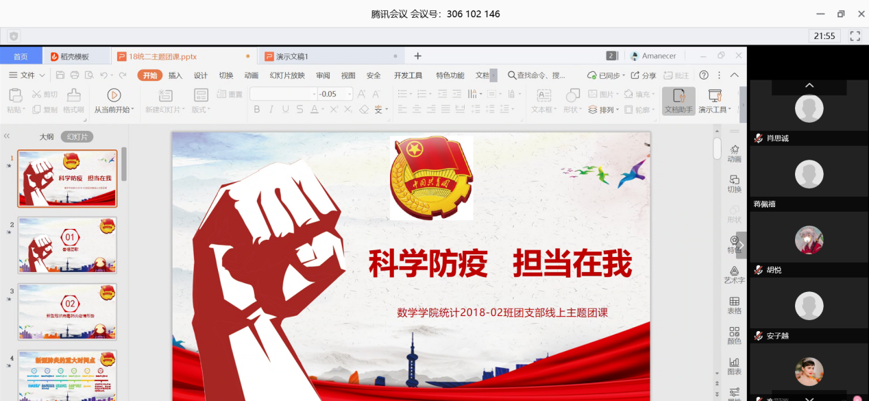 2020年的开年并不太平,新冠肺炎的横空降世极大地影响了中国人民的日常生活。战胜肺炎疫情是全体人民的切实心愿,也是我们共青团员肩上刻不容缓的责任。在这样的背景下,统计学2018级2班团支部以网课的形式,于3月5日开展“科学防疫,担当有我”主题线上团课。团支书李宏亮带领大家上了一堂意义深刻的团课。2138cc太阳集团团委实践部部长孔维强、副部长懂欢宁参加团课,并做“微团课”分享。