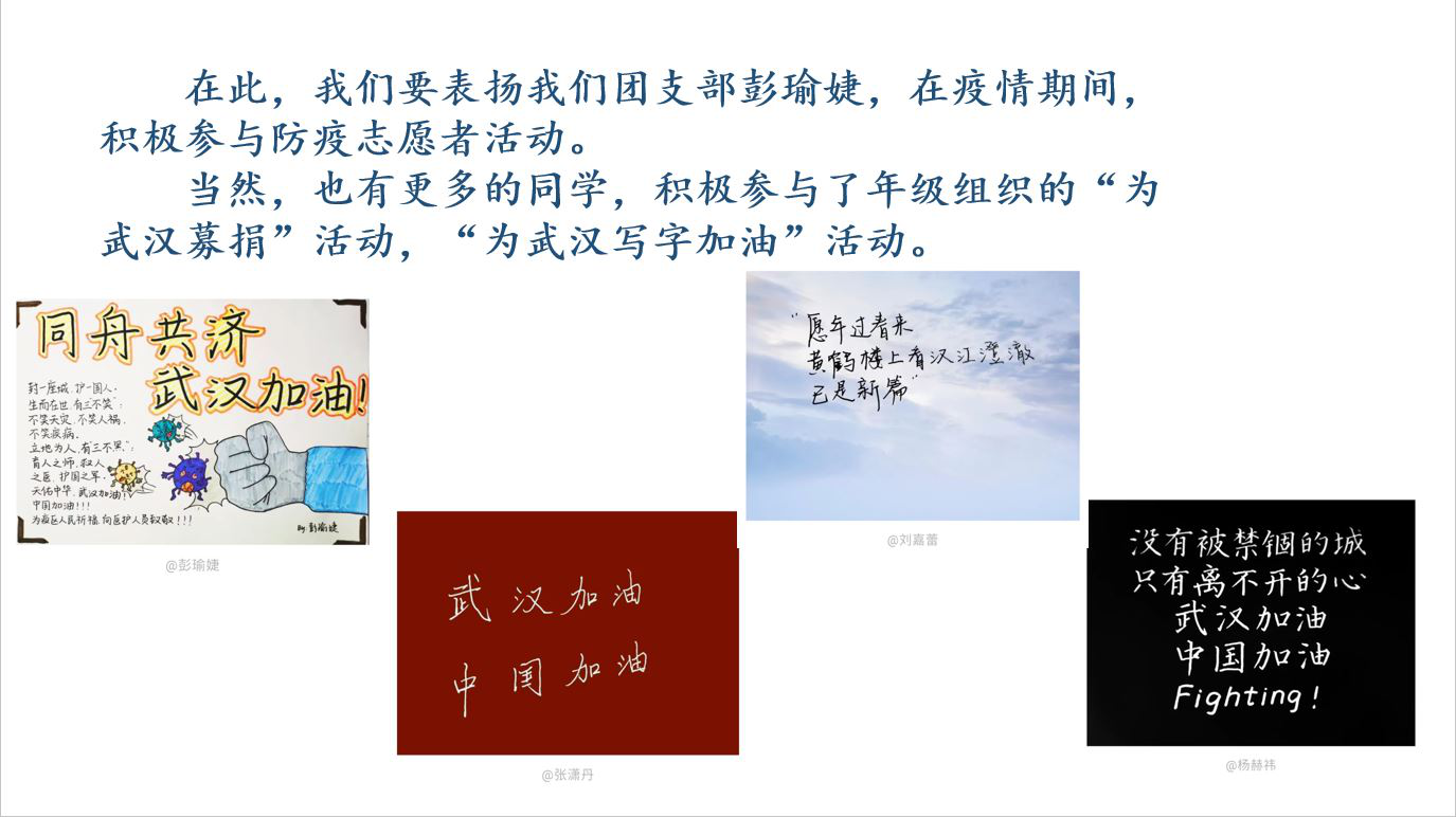 接着,团支部书记吴佩欣讲述了共青团员在这个特殊的时期如何发挥自己的青春力量,承担起新时代团员青年的责任与使命。她强调,党的指令,团的方向。共青团作为党领导的先进青年的群团组织,应充分展现青年突击队的作用,听从党的号令,积极投身抗击疫情的重大政治任务。要坚持“安全第一”的原则,注意防护措施,合理选择志愿方式,坚决打赢疫情防控阻击战。吴佩欣指出,在疫情期间,统计一班团支部很多团员积极地参与到了防疫宣传、为武汉募捐、手写加油等活动,特别赞扬了参与防疫志愿服务活动的彭瑜婕同学,并向大家展示了学院另外两项志愿活动的成果。