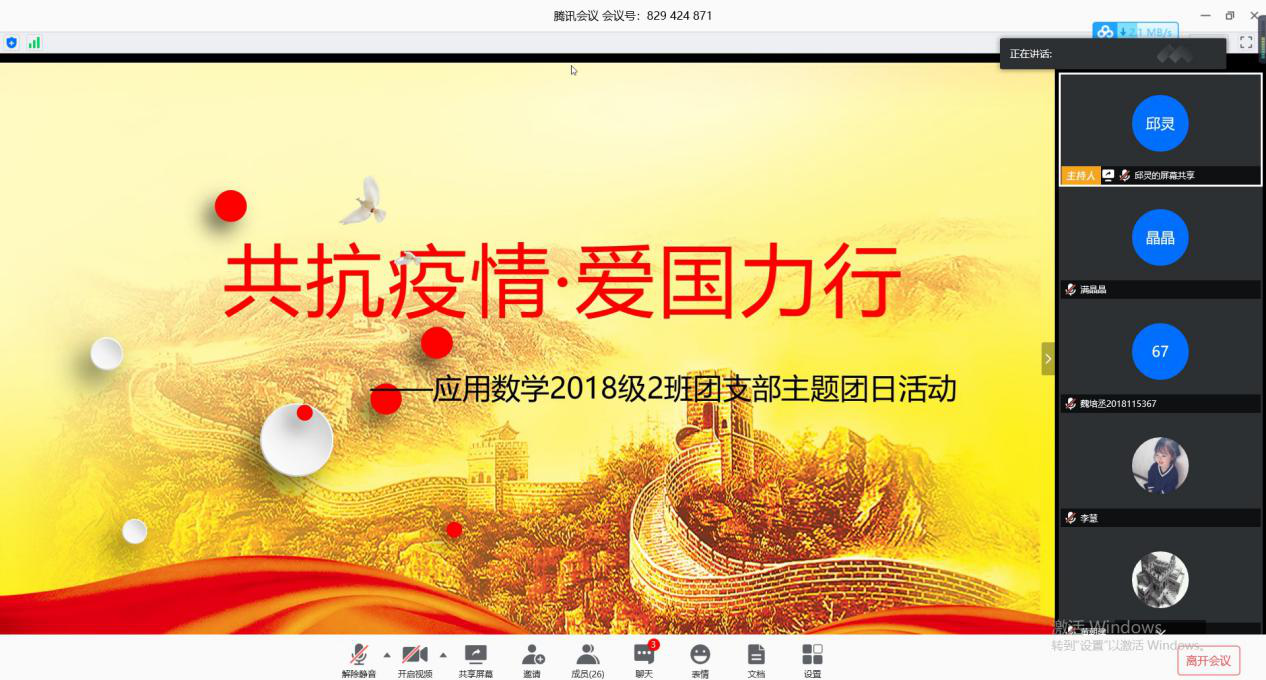 为深入学习贯彻党的十九届历次全会精神和习近平总书记关于青年工作的重要思想、习近平总书记关于打赢新型冠状病毒感染肺炎疫情防控阻击战的重要指示精神,激发支部团员青年的责任担当,坚决打赢疫情防控的人民战争、总体战、阻击战,根据学院团委要求,2138cc太阳集团应用数学2018级2班团支部于2020年4月24日在线上开展了以“共抗疫情·爱国力行”为主题的团日活动,支部全体团员参与。团委“1+100”支部对接团干部林玉受邀参与活动。