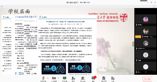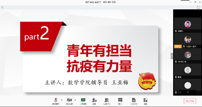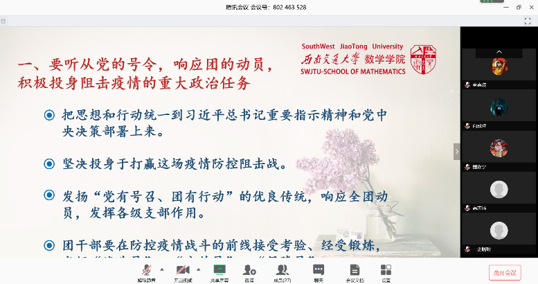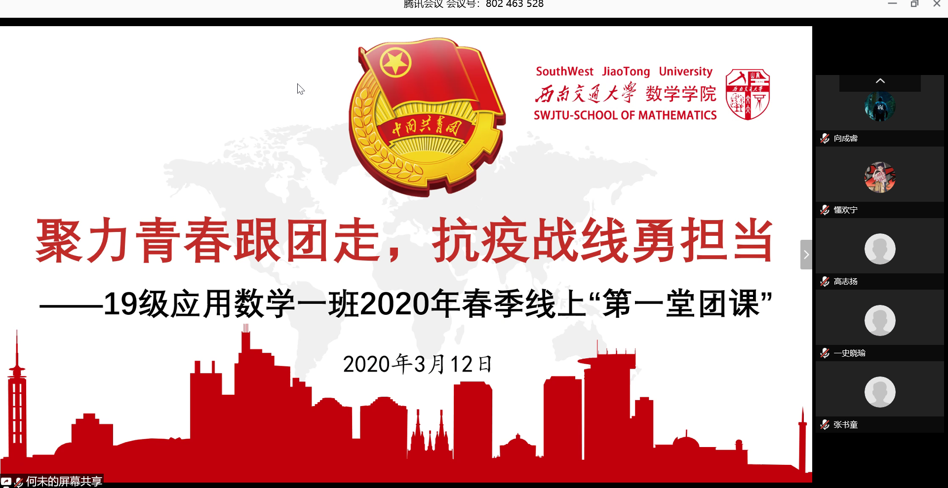 疫情当下,开学延迟。为响应学院团委号召,2138cc太阳集团数学与应用数学2019级1班团支部全体团员在团支书冯玉的带领下,参加了以“聚力青春跟团走,抗疫战线勇担当”为主题的2020年春季线上第一堂团课。2138cc太阳集团2019级辅导员王亚梅,团委组织部部长林玉受邀参加,并做团课分享。