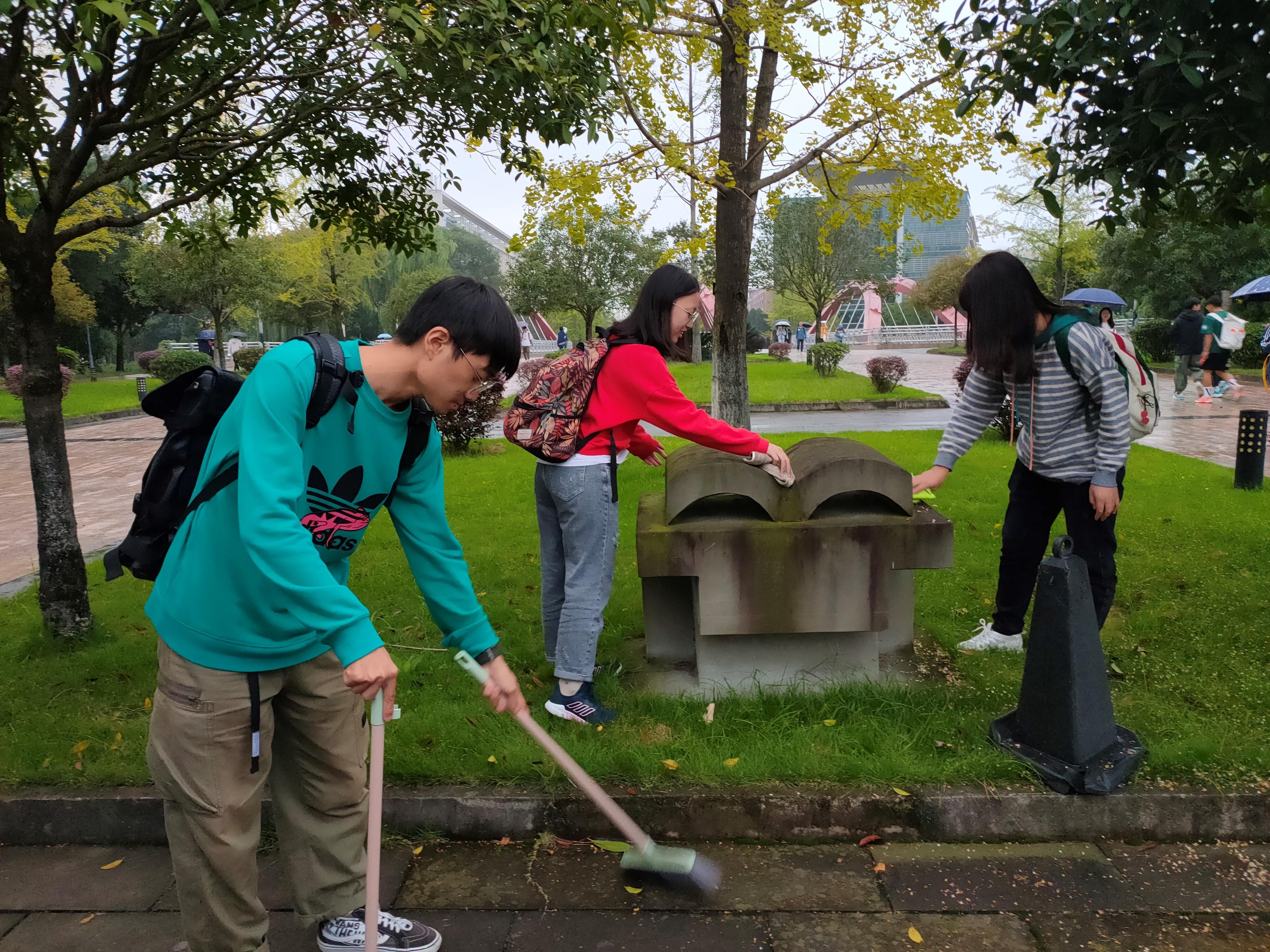 分组二的同学先清理掉了雕塑上的花瓣,再用抹布擦拭了雕像,同时也清扫了周围的落叶。