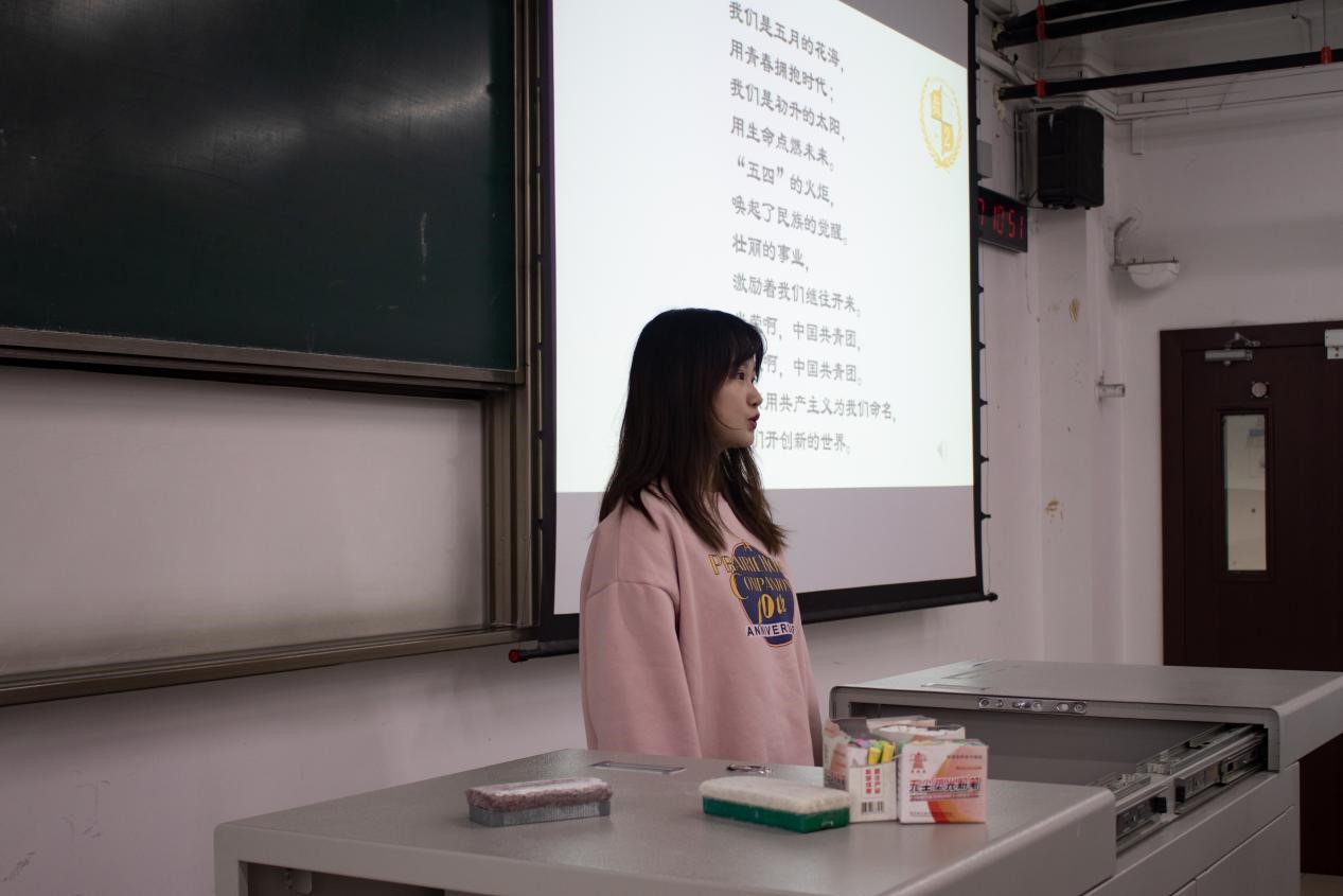 接着,为营造节约为荣的氛围,使节约理念深入人心,邱灵播放了一个关于“厉行节约,反对浪费”的宣传短片。宣传短片以轻松欢快的方式向各位团员展示了“一粥一饭当思来之不易”,同学们都深深地到了粮食节约的重要性。