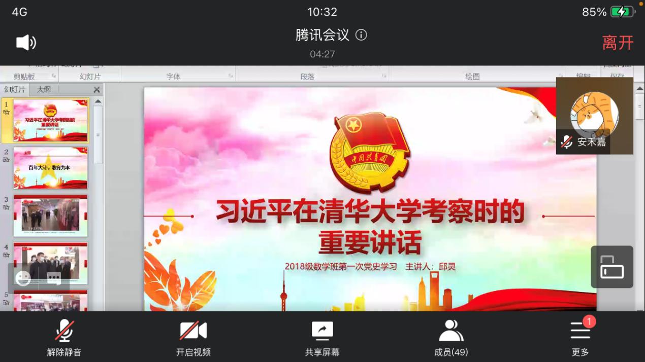 4.27上午10:30,2018级应用数学1班团支部和2018级应用数学2班团支部在线上开展党史学习教育,学习了习近平总书记在清华大学考察时的重要讲话,各位团员围绕“百年大计,教育为本”主题展开讨论。