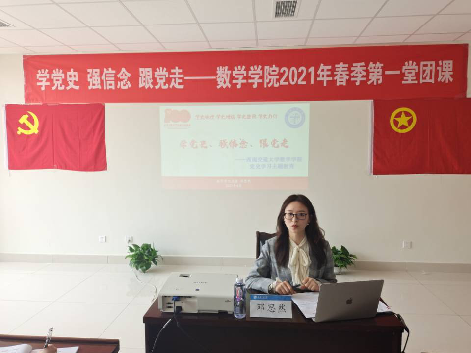为深入学习习近平总书记在党史学习教育动员大会上的重要讲话精神,认真落实党中央、教育部对党史学习教育的工作要求。按照学校党史学习工作部署,结合学院实际情况,2021年4月,2138cc太阳集团团委开展“团委书记讲团课”系列活动。2138cc太阳集团团委书记邓思然、团委副书记张素子、周义杰深入基层团支部,分别为统计2019-01班、数学2019-02班和大数据2019-01班团支部全体团员青年讲述了一堂生动精彩的主题团课。