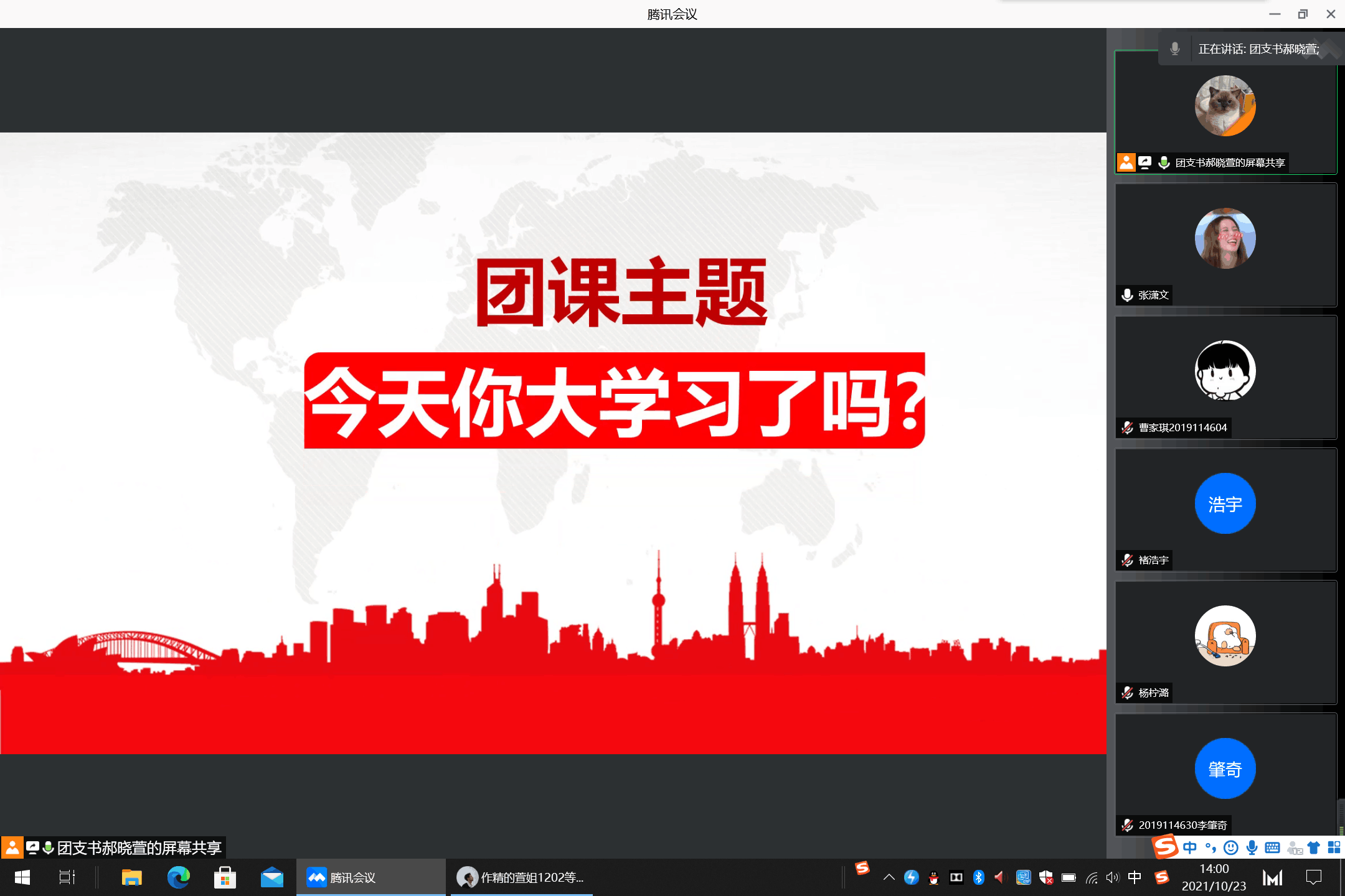 团支书郝晓萱从以往参学比例,日后工作安排和本学年学习内容这三个方面向各位团员强调了青年大学习的重要性,大家也在会议上达成一致,认真学党史,学思想,做社会主义新时代的好青年。