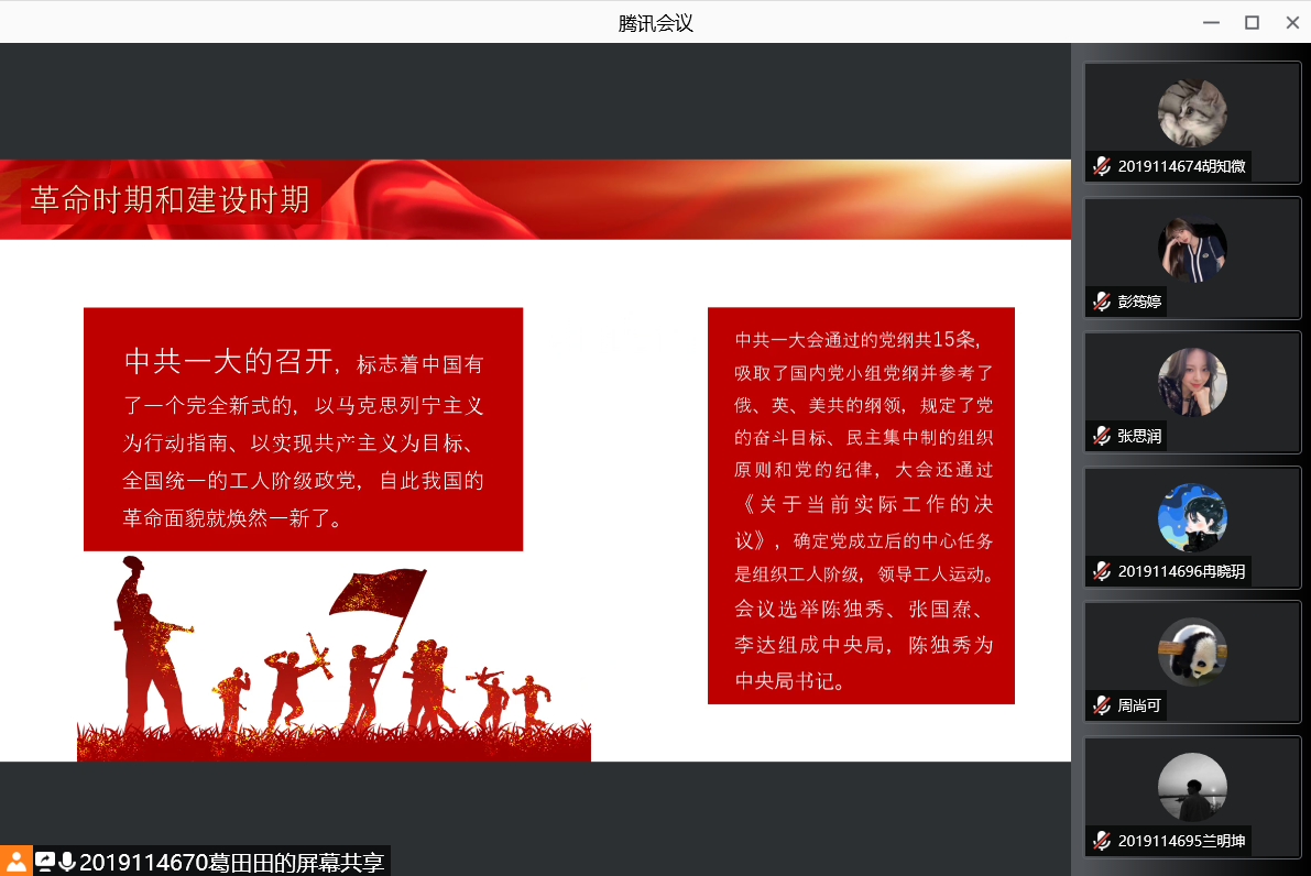 10月22日晚七点,19级统计一班召开了主题为“热烈庆祝中国共产党成立100周年”的秋季开学第一堂团课。会上,团支书与同学们共同回顾了中国共产党走过的百年历程,了解了当前我们党的历史任务,并结合青年人在国家社会发展中的重要作用,展望了未来的国家发展前景。
