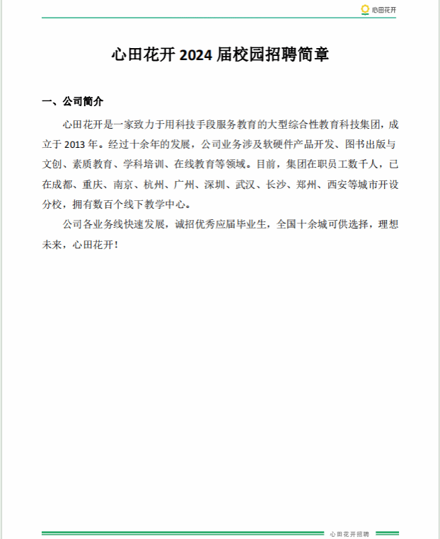 心田花开是目前成都本地最大的线下教培机构,在招【教学管培生】,薪资9k,周内单休周一