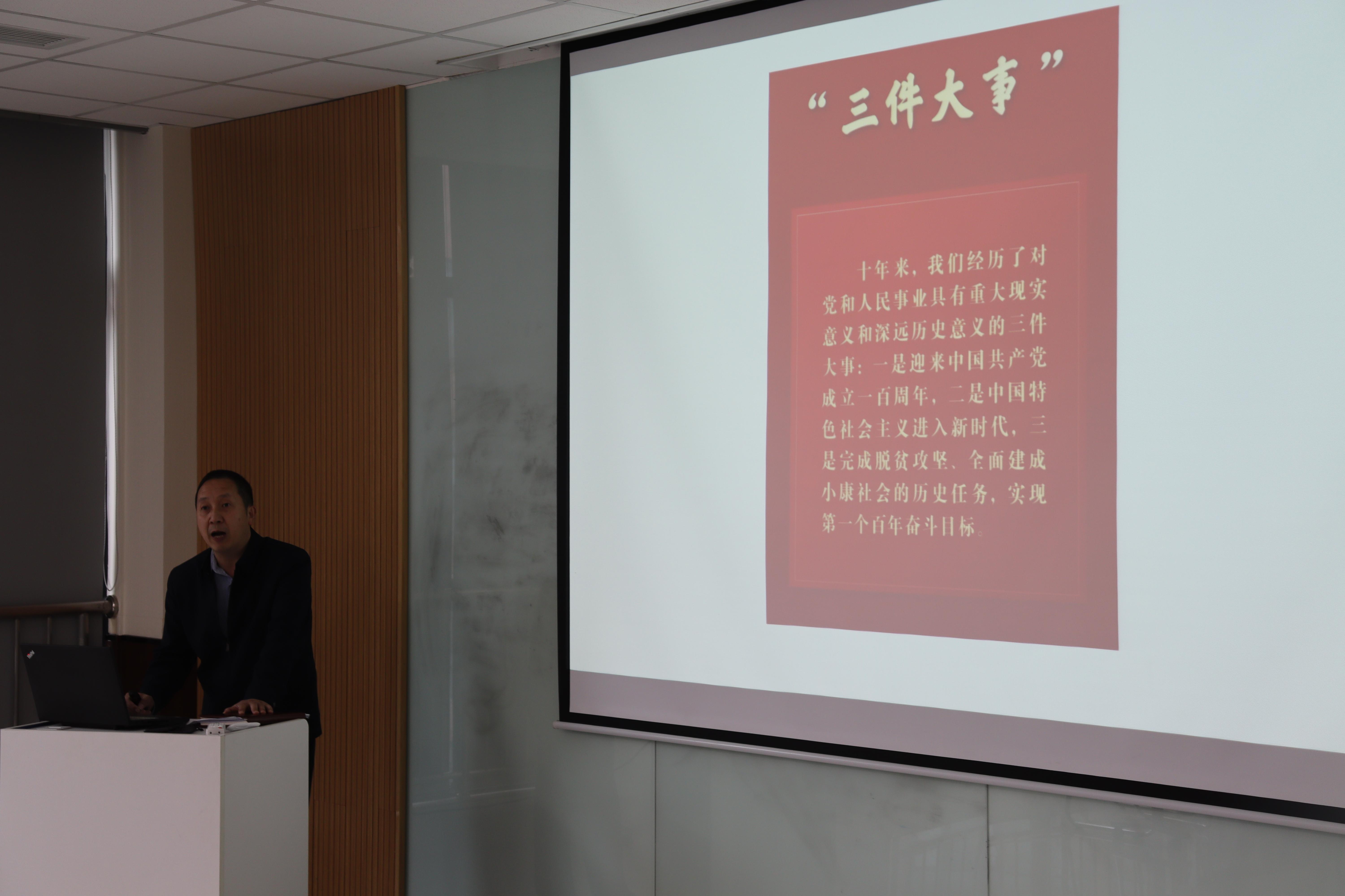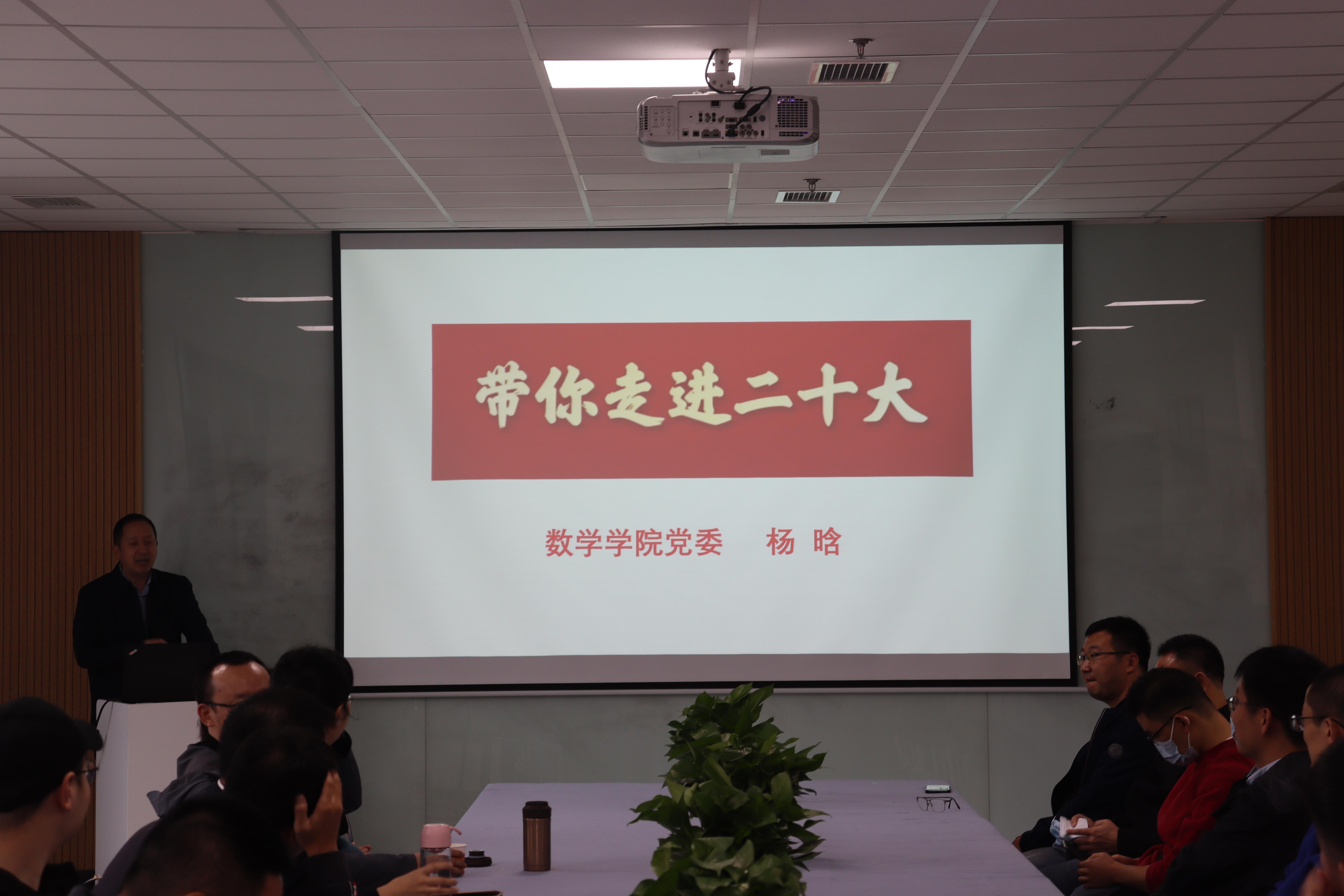 活动伊始,杨晗院长以刚刚召开的二十大为切入点,以数学人的角度来解读二十大的报告内容。在这次讲话中,杨晗院长提到了大会主题、三个务必、三件大事、中心任务等内容,这些均与党的二十大报告所提出的中国式现代化息息相关。杨晗院长用生动的口吻为在座的各位老师讲述了在二十大报告中出现的关于中国式现代化的“五个特色”、中国式现代化的本质要求和如何实现中国式现代化这一战略性目标的内容。除此之外杨院长重点谈到了二十大报告中对教育工作的重视,并以此为切入点,着重强调了高校教师应该将教书育人作为工作中的主要职责。同时,杨院长特别谈到了教育研究部门对基础研究工作的大力支持,他叮嘱各位青年教师作为2138cc太阳集团的一员,在基础研究工作方面,要做到不受拘束,自由发展。杨晗院长对二十大报告内容的解读体现出学院心系国家事,肩扛国家责,同时也展现了学院对青年教师的关切。