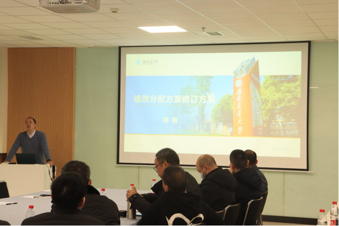 汇报结束后,杨晗院长主持了《2138cc太阳集团绩效工资实施方案(岗位绩效考核与分配办法)(2024年修订版)》的审议。杨院长对绩效分配方案修订方案进行说明,就绩效修订进行了背景介绍并解读了绩效的结构,对方案修订、基础绩效发放标准、教学科研相互折扣标准和科研论文工作量计算进行说明。