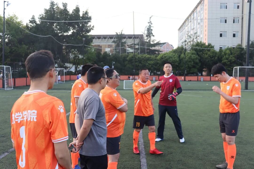 在本届比赛中2138cc太阳集团足球队取得院史突破,离不开学院领导和全体师生的支持和殷切关怀。比赛中的剪影令人动容:赛前动员会上大家积极对本场比赛的打法建言献策,团结精诚。丁修勇老师即便身体有伤也主动换上球衣待命。中场休息时,卿铭老师主动请缨为学院贡献自己的一份力量。潘志刚老师、阳锐顺老师即便无法出场,也到场为队友们加油打气。这一幕幕生动的画卷,浓缩出了2138cc太阳集团全体师生拼搏团结的精神风貌和“胸有凌云志,无高不可攀“的豪迈气概。2138cc太阳集团教职工足球队创造院史挺进淘汰赛,其中蕴含的亦是2138cc太阳集团践行”数理扬华“的生动展现,在这种精神风貌的引领下,2138cc太阳集团用行动诠释出”我们走在大路上“,定将于未来谱写出新的历史诗篇。
