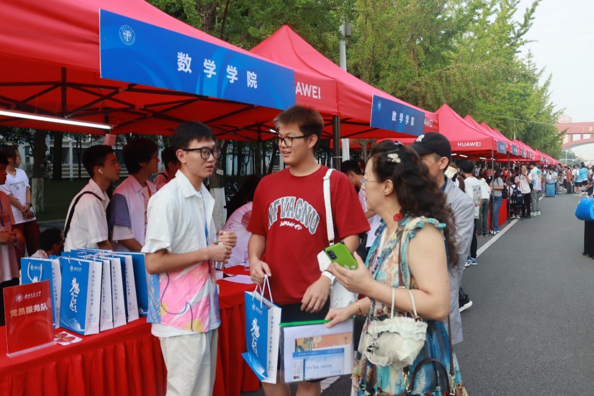 上午8时,第一批新生来到迎新点报道。在志愿者们引导下,新生们有序排队、信息校核、网上确认、领取物资,之后乘坐摆渡车前往宿舍。