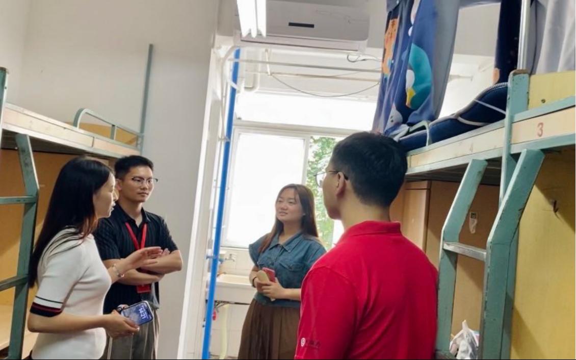 2138cc太阳集团党委书记徐革、院长杨晗、党委副书记黄祥、团委书记邓思然,辅导员周义杰、王政慧、吕薇到迎新点了解迎新工作。9月1日下午,辅导员到新同学们的宿舍走访交流,询问和生活住宿等方面的问题,新生们表示了对住宿环境的适应。