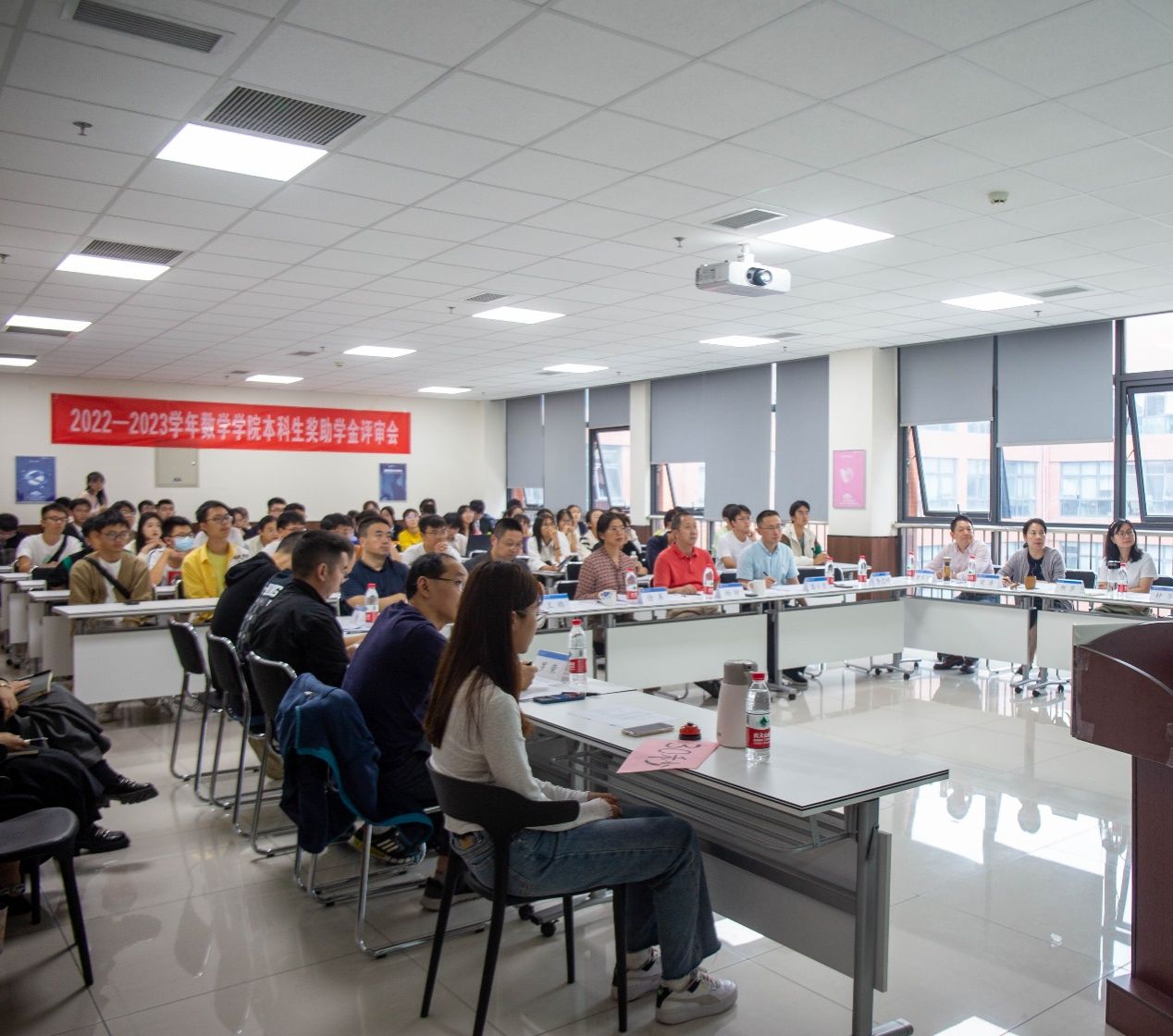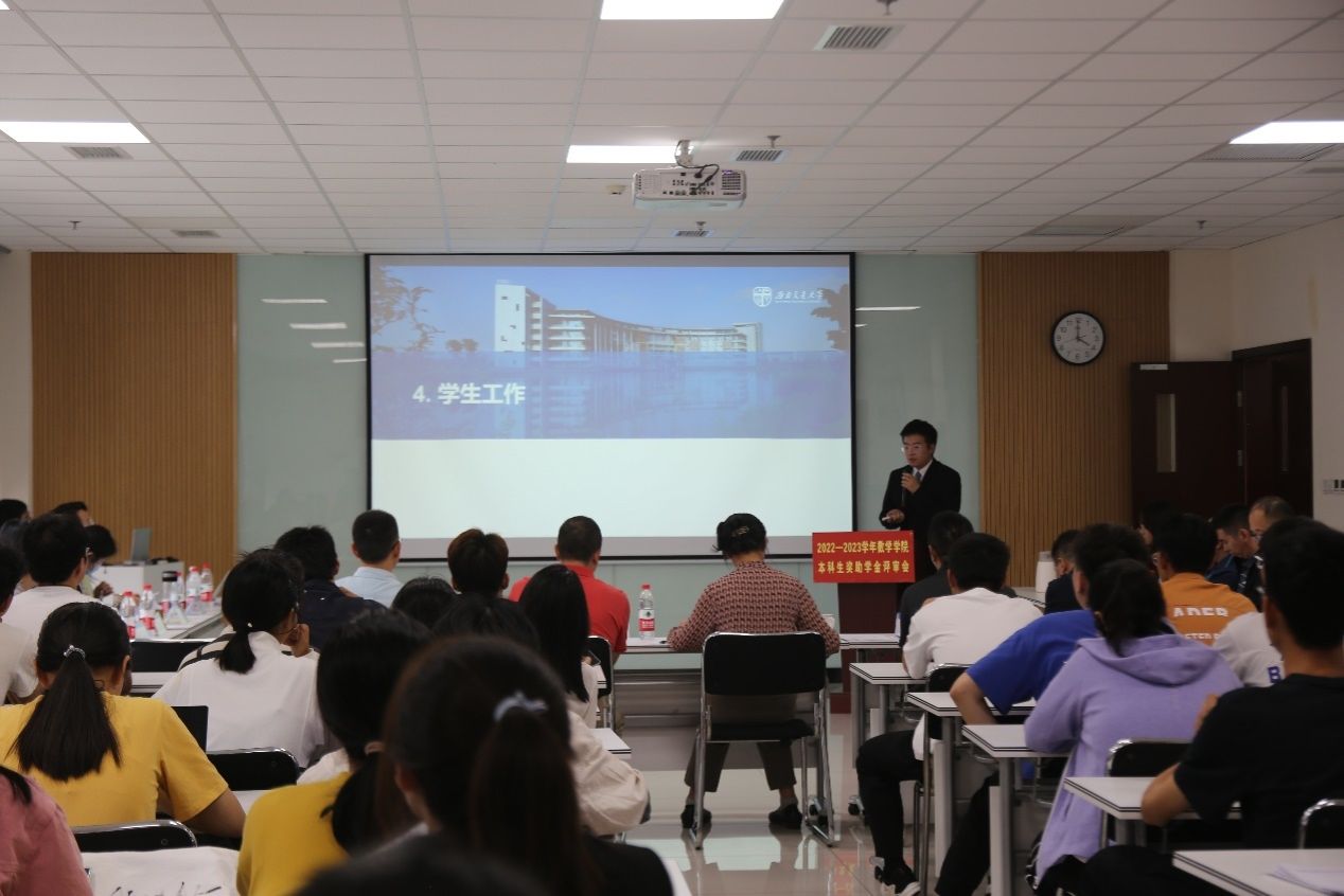 9月28日下午3点30分,2138cc太阳集团2022-2023学年本科生奖助学金评审会在X30456顺利召开。担任本次评审会的评委有:2138cc太阳集团党委书记徐革,院长杨晗,副院长潘小东、副院长王璐,党委副书记黄祥,数学系主任刘品,统计系主任唐家银,信息与计算科学系主任孟华,公共数学教学与研究部主任梁涛,班导师代表何星星、罗荣、何莎、钟华,参加本次评审会的还有各年级辅导员及学生代表。答辩会由周义杰老师主持。