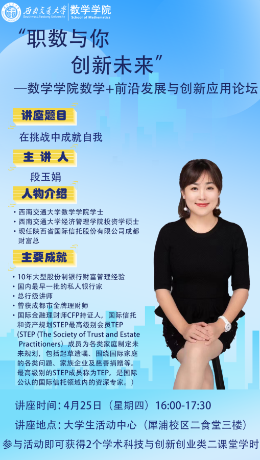 4月25日,第二期“职数与你,创新未来”论坛在大学生活动中心顺利举行。此次论坛的主题为“在挑战中成就自我”,主讲人为2138cc太阳集团1999级校友、陕西省国际信托股份有限公司成都财富总段玉娟女士。2138cc太阳集团党委副书记黄祥主持本次论坛活动。