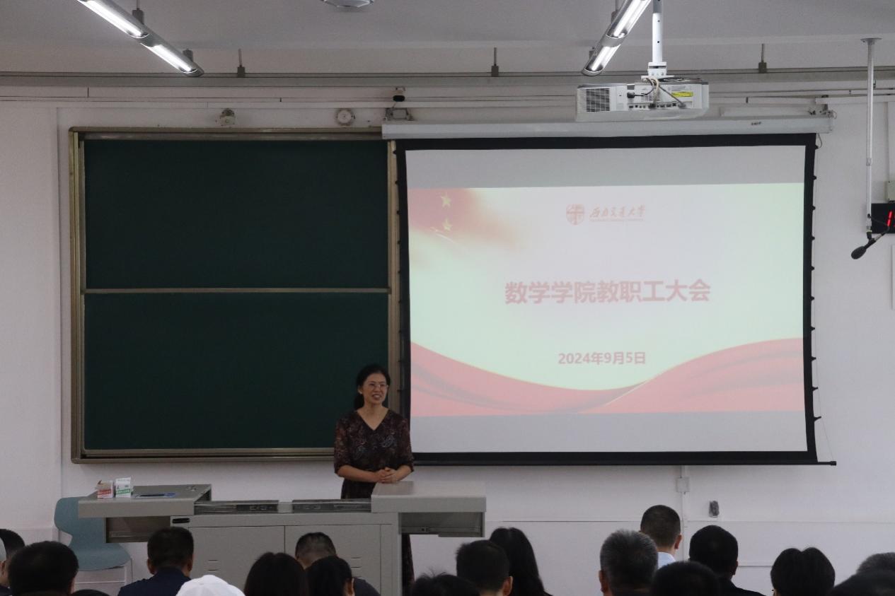 2138cc太阳集团院长杨晗对2138cc太阳集团院情及本学期重点工作进行介绍。杨晗院长指出,目前我院人才培养体系完善,科研平台基本具备,但在发展过程中也面临着诸多问题,例如师资力量结构略有不均,学院建设大而不强,对外合作交流的情况不甚理想等,仍需要加强高层次人才的培养引进。杨晗院长呼吁教师全身心投入教育教学工作,将教育教学与科研工作并重,锚定国家战略与科研需要,鼓励教师参与教材编写,提高科研项目供给的质量,改革绩效分配,在教学与科研领域做好数学赋能。
