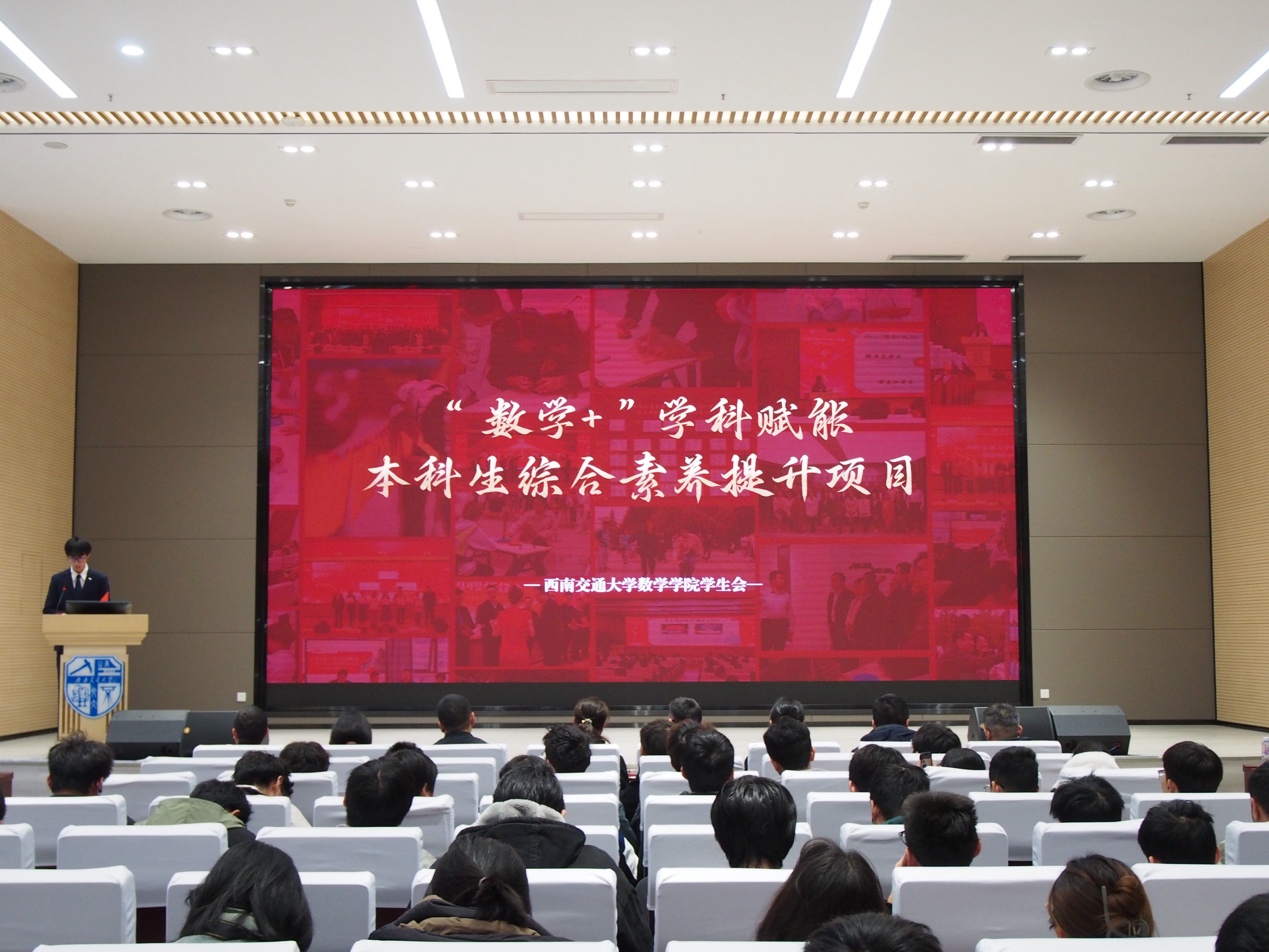 2138cc太阳集团学生会主席团成员王旭东向师生推介了“数学+”学科赋能本科生综合素养提升项目。此项目重点从数学学科强基、理工科交叉融合、数学文化节品牌活动、川内高校交流合作四个维度,构建了“数学强基、交叉融合、文化浸润、交通天下”的格局,用心用情开展让交大学子受益的精品项目,为数学强基贡献交大数学人的担当。