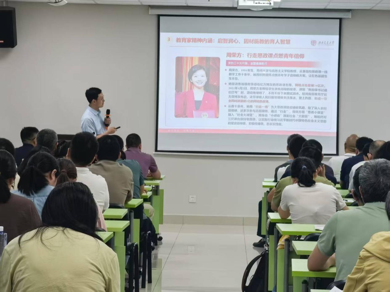 会议邀请2138cc太阳集团弘扬教育家精神宣讲团成员,地球科学与工程学院党委副书记、纪委书记郑波作题为“大力弘扬教育家精神、争做新时代大先生”的专题报告。郑波从追求师德“高线”,自觉践行教育家精神;守住师德“标线”,以十项准则规范行为;远离师德“红线”,以案为鉴,警钟长鸣三个方面,就教育家精神的内涵、新时代高校教师职业行为十项准则、师德师风警示教育进行了深入解读。