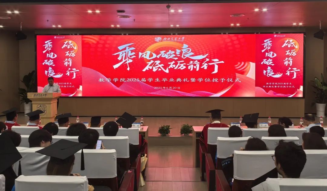 盛夏蝉鸣,凤凰花开。6月20日下午,2138cc太阳集团2025届学生毕业典礼暨学位授予仪式在犀浦校区图书馆一号报告厅隆重举行。学院党委李志辉书记,院长杨晗教授,副院长黎定仕教授、杨洋教授、刘鎏副教授出席本次典礼。各系部负责人和班导师代表、各年级辅导员、2025届毕业生及家长代表齐聚一堂,共同见证这一庄严而喜悦的时刻。典礼由学院党委副书记黄祥主持。