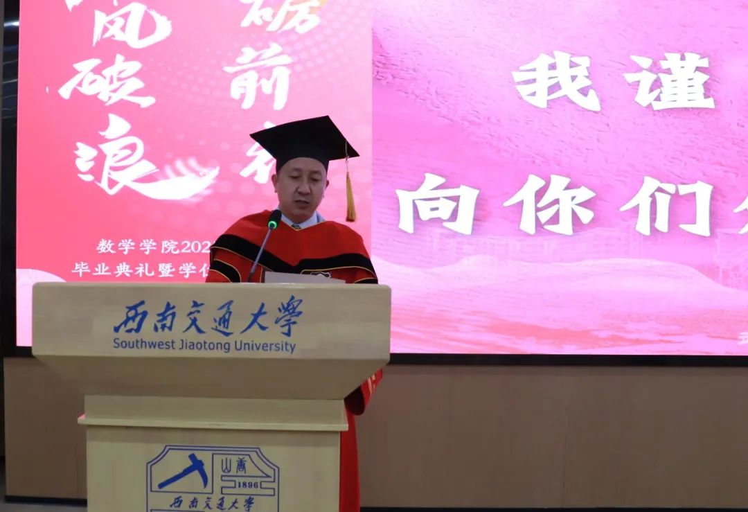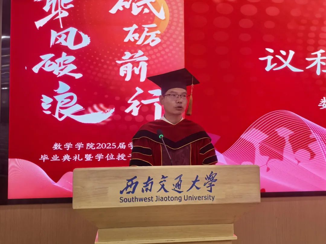 杨晗院长致辞,他代表2138cc太阳集团全体教职工向2025届毕业生们表示最热烈的祝贺。临别之际,他结合学科特色,运用数学语言寄予临别期许。