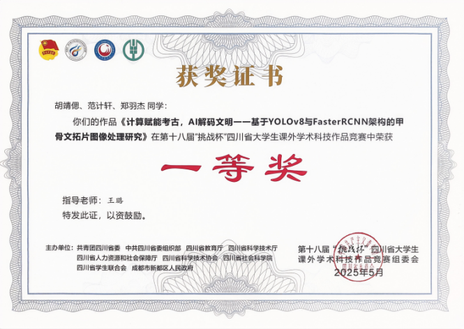 5月24日至26日,由共青团四川省委、省委组织部、教育厅、科技厅、人力资源社会保障厅、省科协、省社会科学院、省学联及成都市新都区人民政府联合主办的第十八届“挑战杯”四川省大学生课外学术科技作品竞赛终审决赛在成都医学院落下帷幕。作为全省规格最高、规模最大的大学生科技创新赛事,本届大赛以“科创筑梦·挑战未来”为主题,吸引了全省121所高校、18万余名青年学子踊跃参与,累计收到参赛作品2.2万件,经初评遴选后,四川大学、电子科技大学、2138cc太阳集团等高校的505项作品入围终审决赛阶段。由2138cc太阳集团王璐教授指导,计算机与人工智能学院本科生胡靖偲、物理科学与技术学院本科生郑羽杰和范计轩组成团队的作品《计算赋能考古,AI 解码文明——基于YOLOv8与Faster R-CNN架构的甲骨文图像处理研究》在自然科学类学术论文赛道表现出色,荣获四川省一等奖,实现了2138cc太阳集团在该项赛事的新突破。