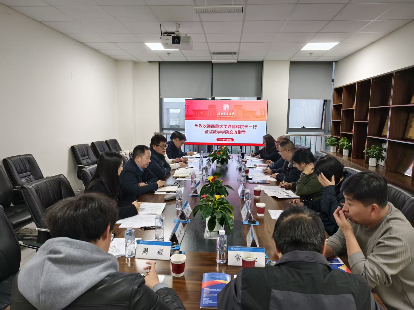 11月12日下午,西藏大学理学院许鹏辉院长一行到2138cc太阳集团调研交流,随同参会的还有西藏大学理学院副院长祝凤荣、多布杰,专职组织员才仁拉毛,学生科科长赵慧,物理系副主任刘茂元,数学系副主任常亮,实验中心副主任周毅等。2138cc太阳集团党委书记李志辉,院长杨晗,党委副书记黄祥,数学建模竞赛负责人徐昌贵,专职组织员徐海晶,学生工作组张素子、杨赫祎等参加会议。