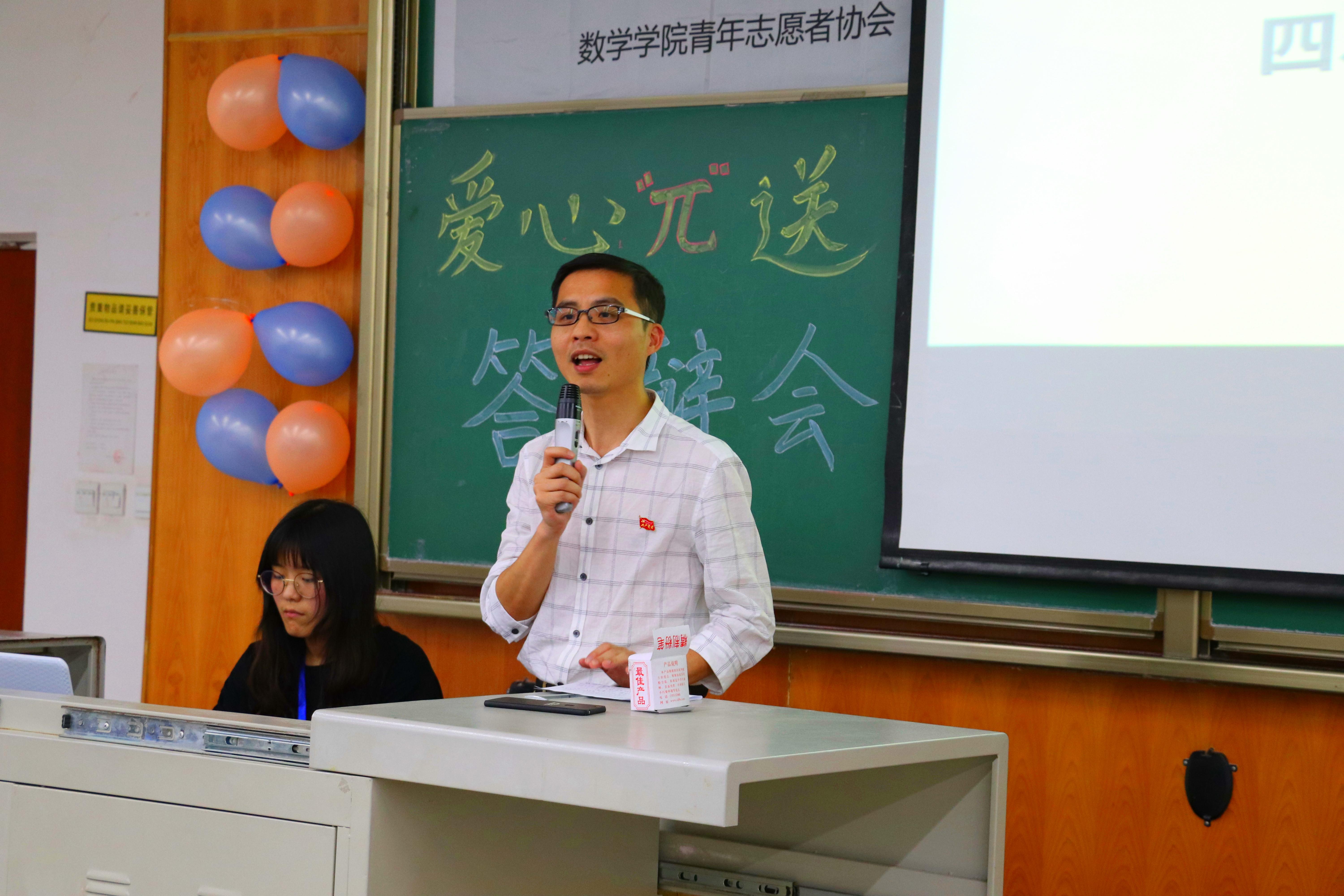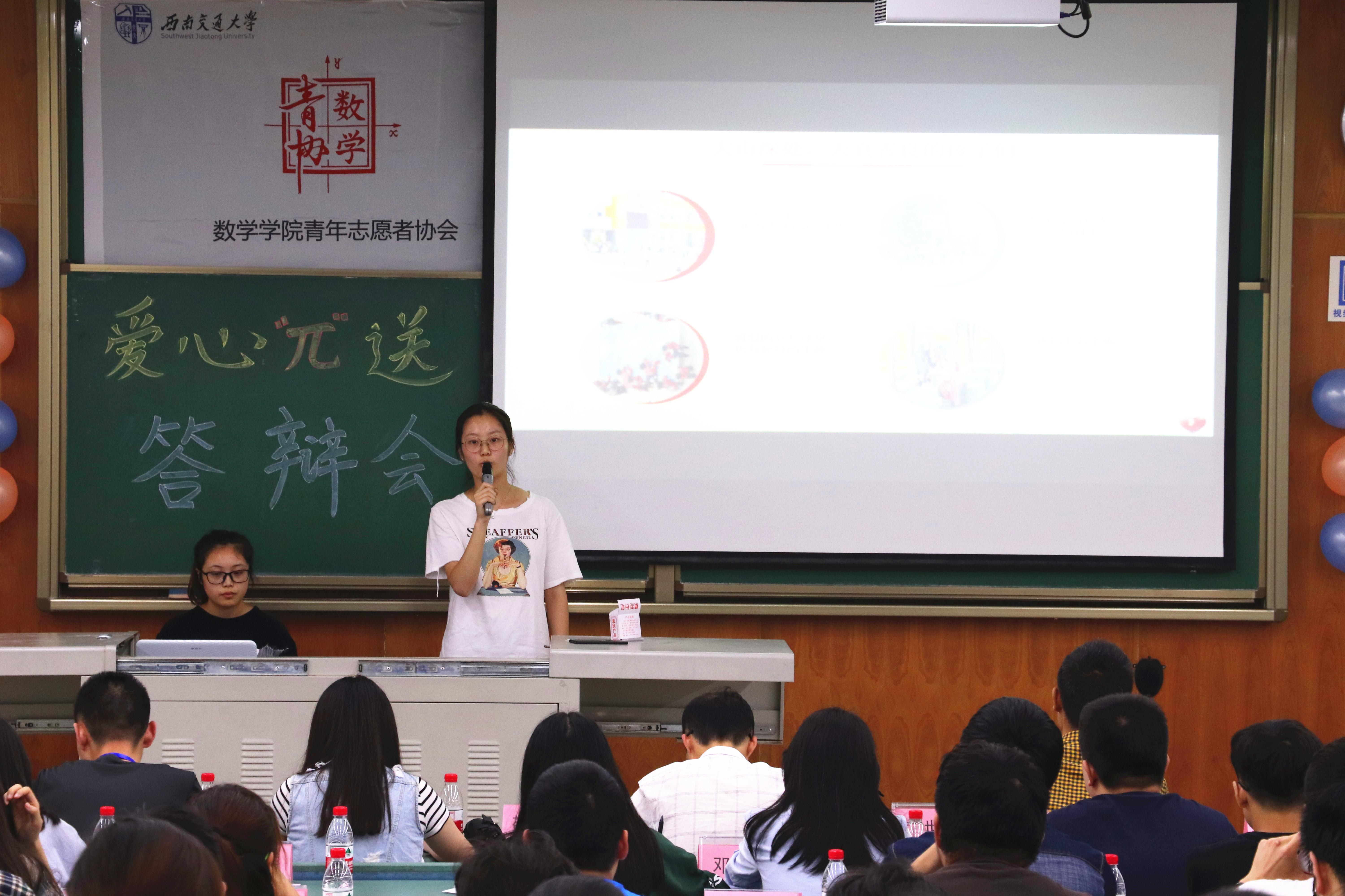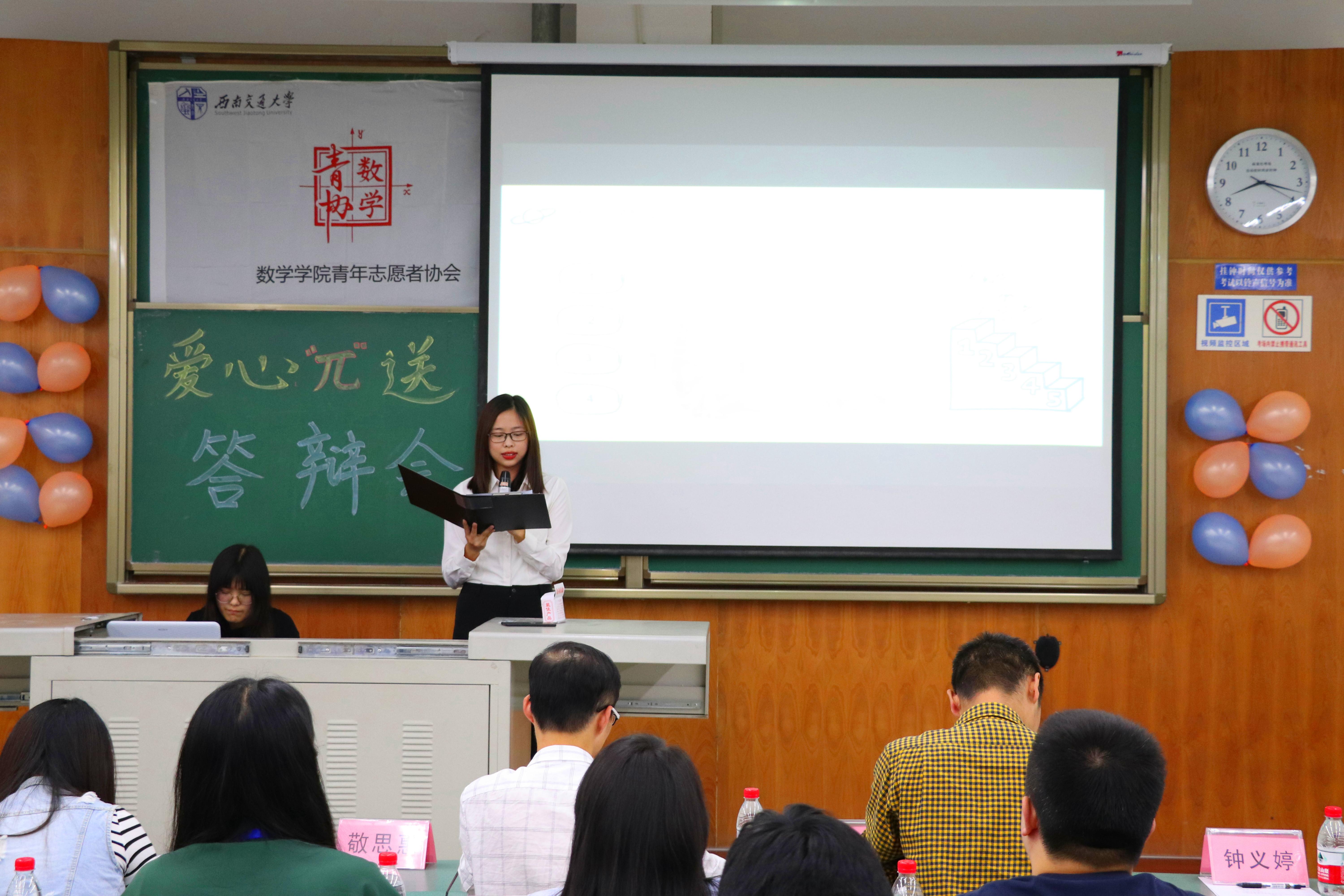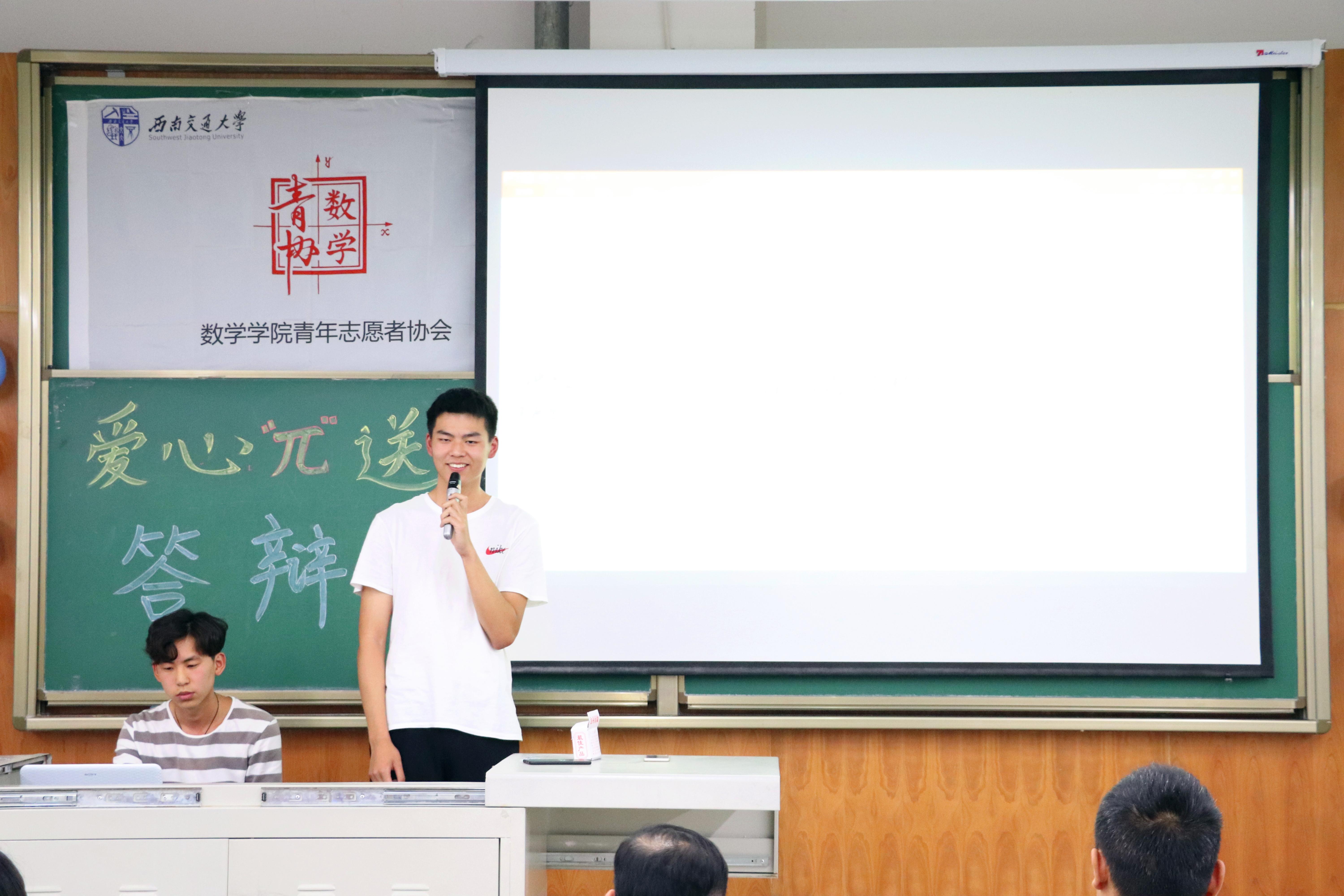 5月24日晚上7:30,2138cc太阳集团青年志愿者协会在X4153举办了主题为“爱心π送”的支队“1+1”答辩会。出席本次答辩会的有:2138cc太阳集团党委杨育鸿副书记,数院青协指导老师敬思惠老师,辅导员丰世隆老师,西南交大社团联合会黄梓幸理事,青年志愿者协会秦天宇主席、王汇川副主席,数院学生会、新闻中心主席,以及土木、建筑等院青协主席。