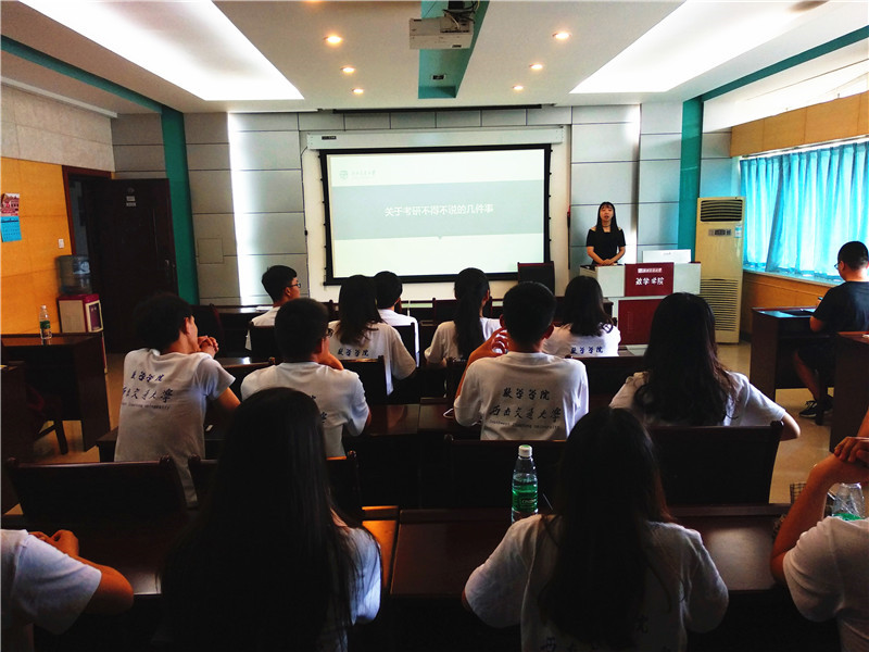 下午2点半,营员与硕博学长的对话会在X2511由卢怡帆老师主持进行。第一位学长分享了自己在西南交大本硕6年的经历,并且非常热情地解答了同学的问题。第二位学长主要提到在研究生生涯需要认清自己的想法,根据自己所确定的方向来确定自己所需的知识和能力,同时要打好自己的基础。第三位学姐是考研成功来到西南交大的,她以自己切身的考研经历来告诉备战考研中可能会遇到的困难,并告诫营员们考研要有必胜的决心。