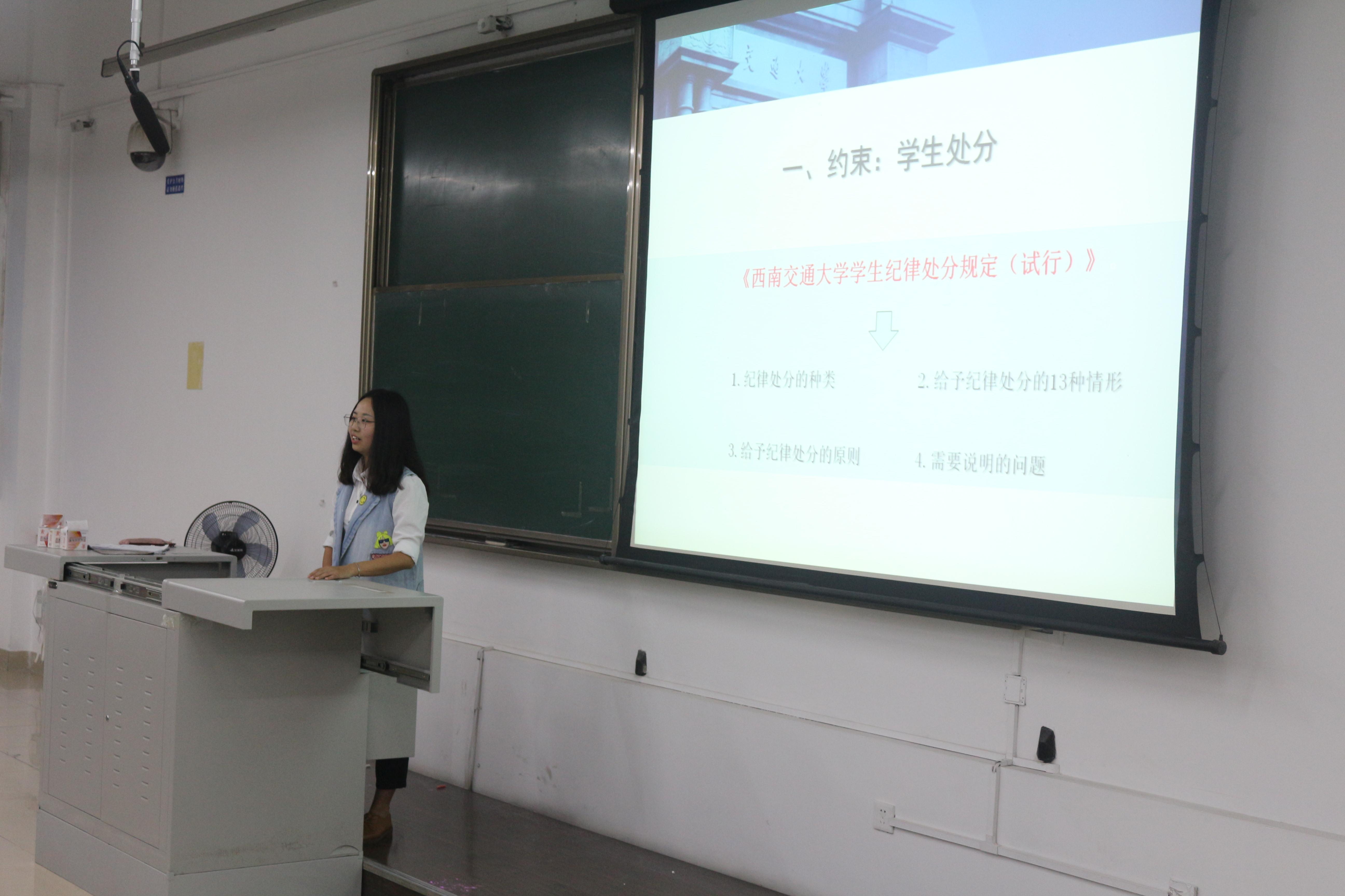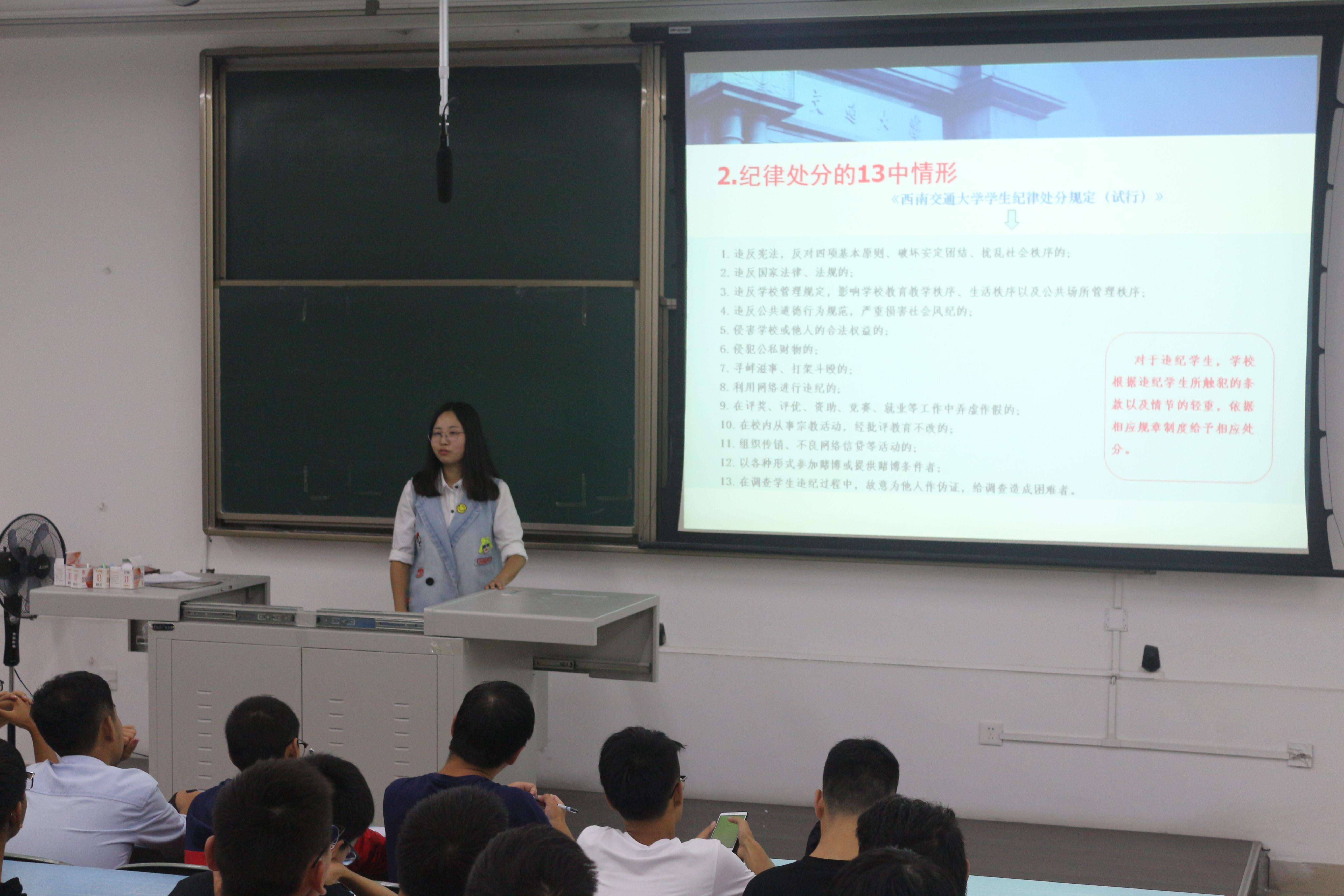 7点整,钟义婷老师首先为大家讲解了《2138cc太阳集团本科生管理规章制度汇编》的大体内容。钟老师首先介绍了规章制度的大体分类,帮助同学们更清晰地理解学校的管理制度。随后,钟老师从13种处分情况入手,为新生们讲解学校处分的规矩,并告诫大家守规矩、讲诚信。接着,老师讲解了一些关于荣誉称号的问题,旨在让大家正确认识奖学金与助学金,并鼓励大家努力去争取荣誉。
