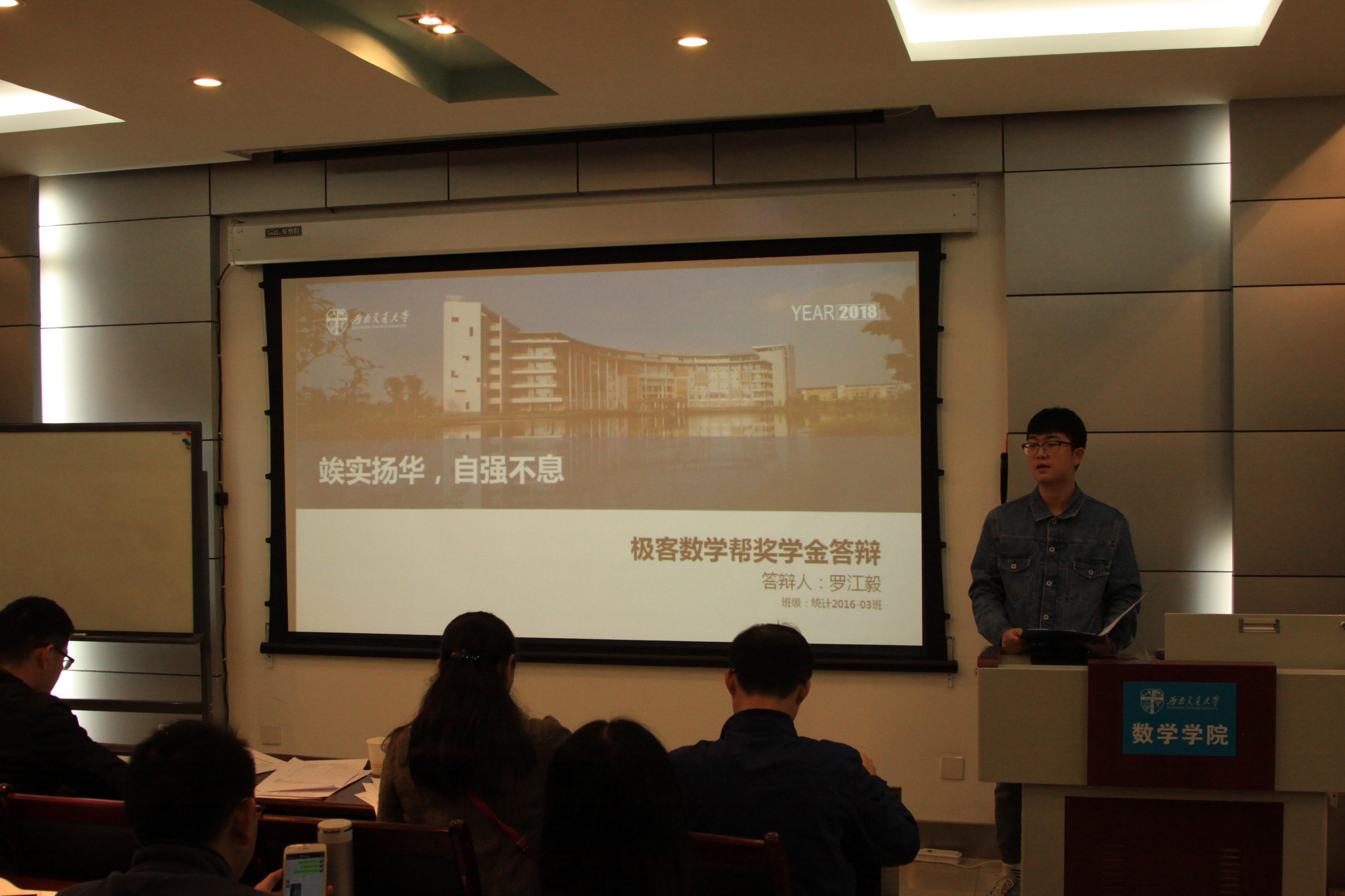 然后进行的是极客数学帮助学金答辩,答辩者介绍了自己的家庭经济情况,也展示了自己在学校取得的一些优异成绩,同时表达了自己在日后继续奋发向上的决心。