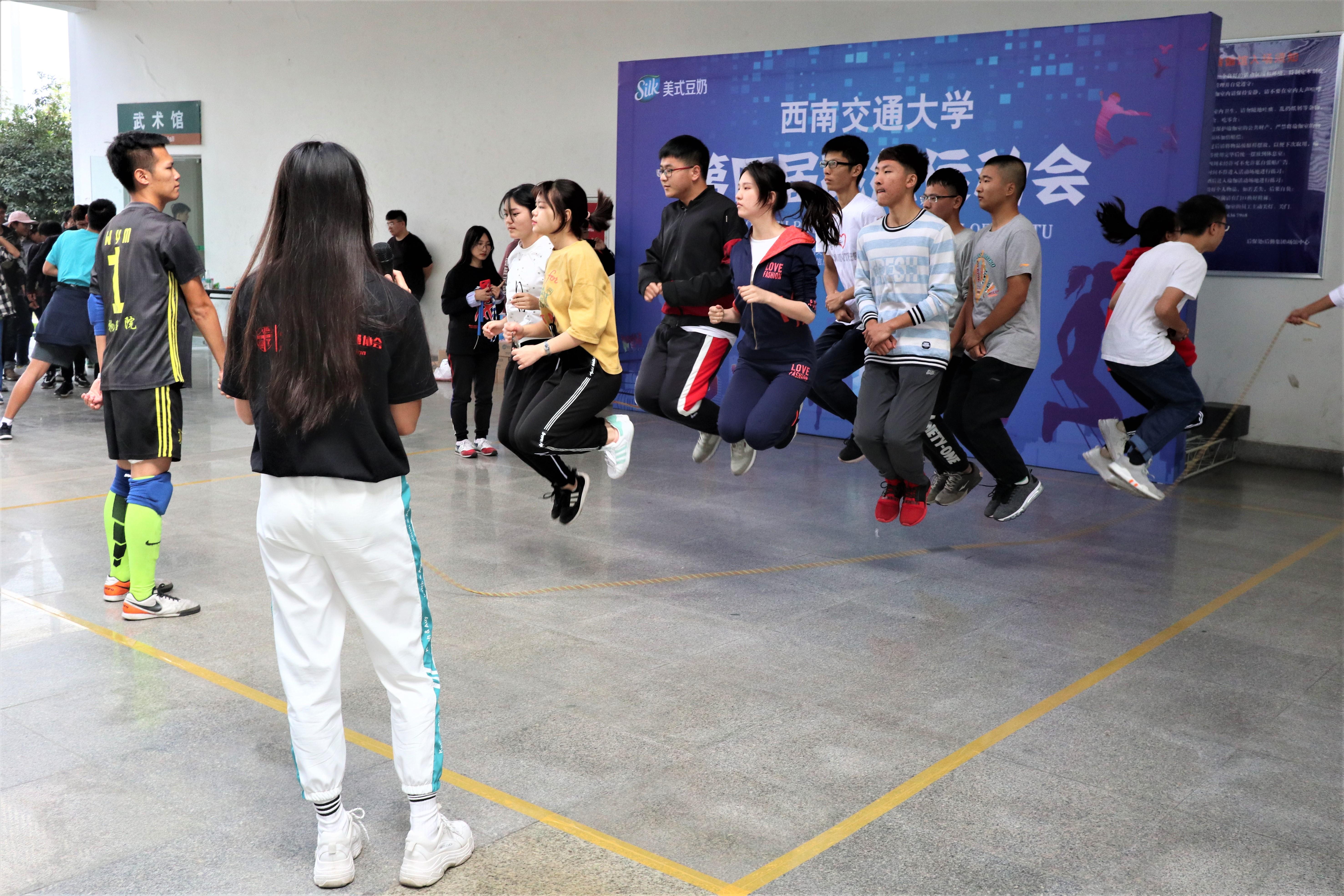 本次运动会以西南交大体育部为主办单位,西南交大花式跳绳协会为承办单位,众多本科生和研究生在飞碟体育馆展开了对冠军的激烈较量。上午9点,随着太阳拨开云雾,开幕式正式开始。首先主办方介绍活动基本信息、到场嘉宾、各学院代表队。接下来分别是奏国歌、花式跳绳表演、领导致词以及运动员代表宣誓和裁判员代表宣誓。随后,主持人宣布比赛正式开始。