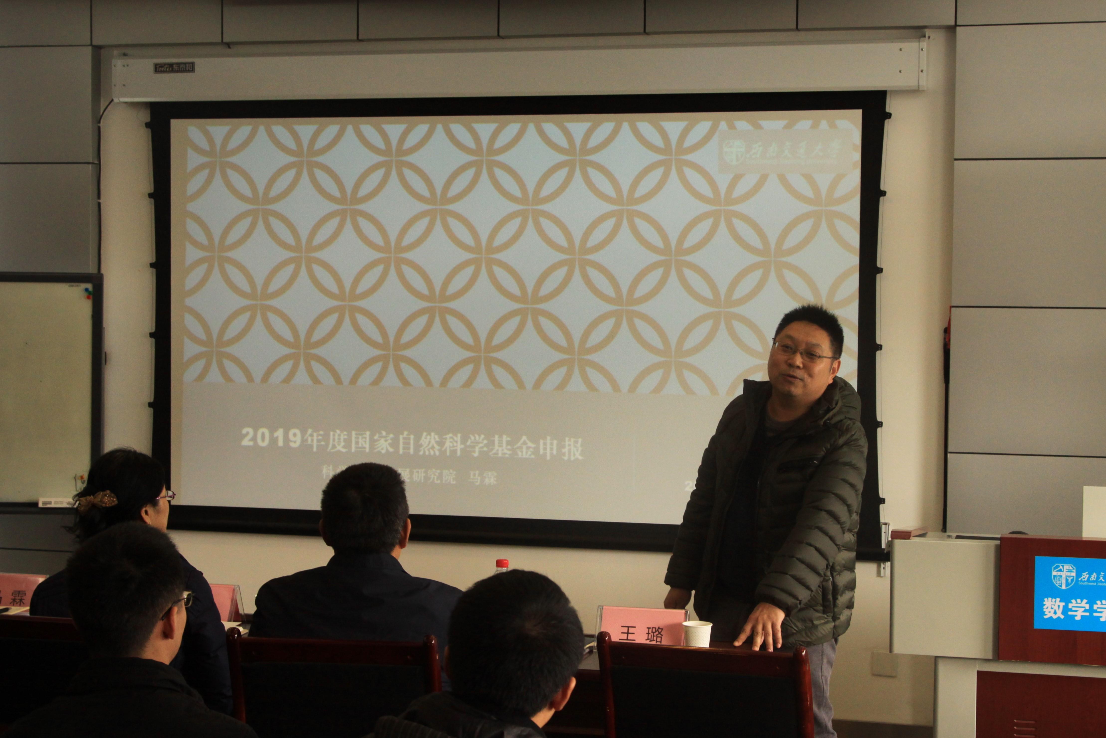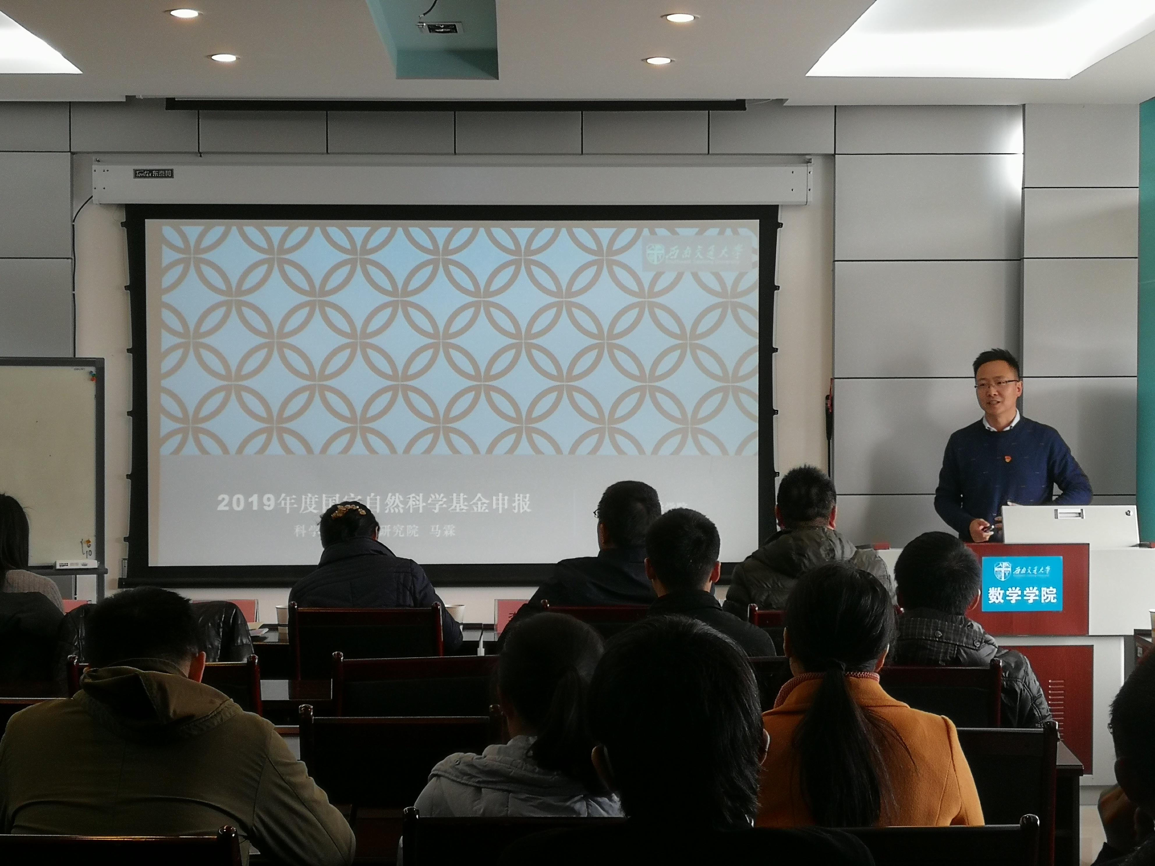 接着,科学技术发展研究院的马霖科长为2138cc太阳集团的老师们详细介绍了有关国家自然科学基金项目申报的流程和细节。马霖老师从“回顾2018”和“展望2019”两个方向切入,首先介绍了交大在2018年的基金申报情况,并通过图表等方式直观地向大家展示了最近几年学校总体的获资助情况。而提到展望2019,马霖老师先详细描述了基金委的一些新出台政策,在此之后又结合2138cc太阳集团教师的基本情况给予了在场老师们一些切实的建议,给新一年老师们的基金申报带来很大帮助。