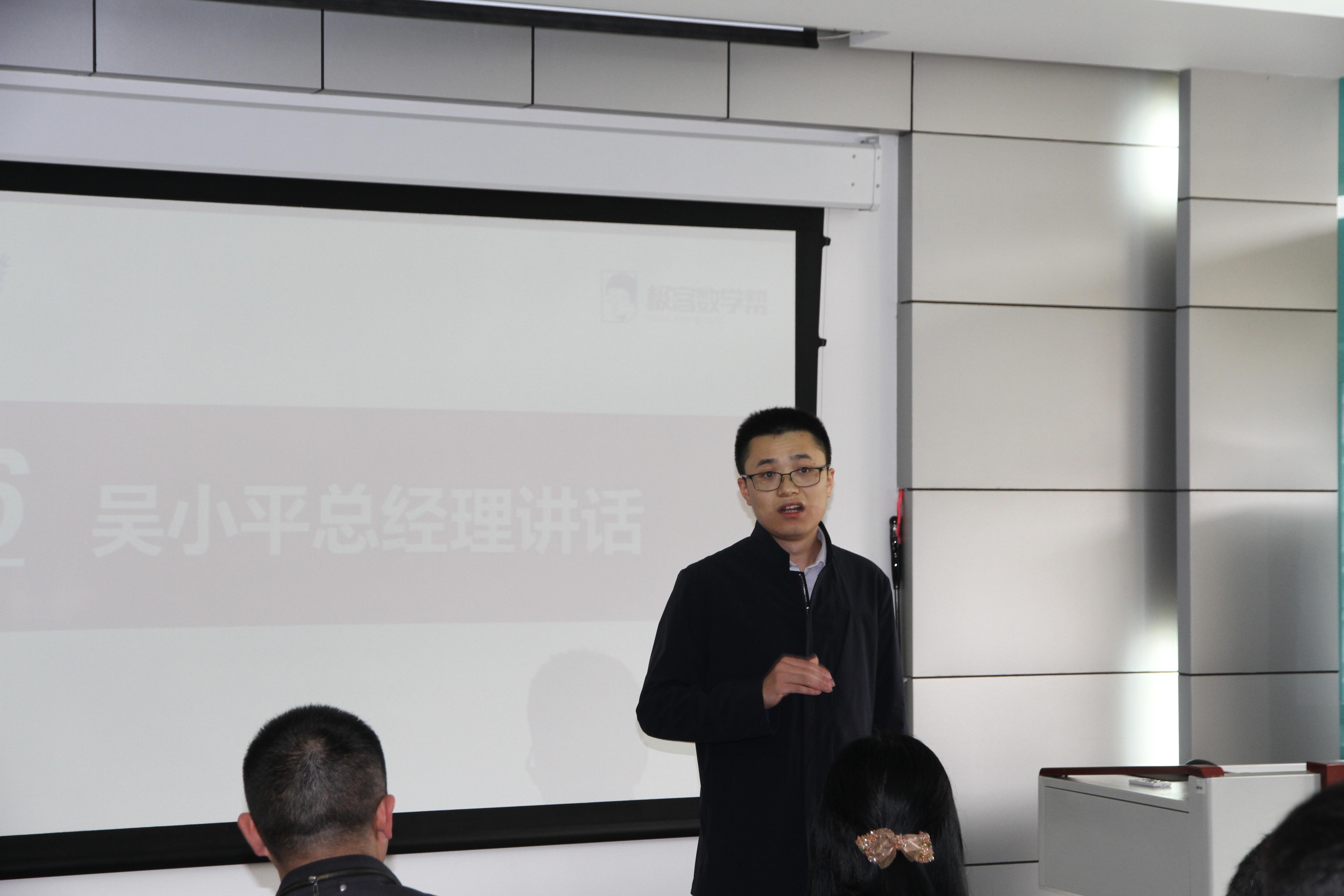 在此之后极客未来教育科技有限公司总经理吴小平先生代表极客数学帮进行了讲话,吴经理首先祝贺了获奖学子,对学校和学院老师们的辛苦付出和栽培表示感谢,之后便向在场的同学们详细介绍了极客数学帮并指出其与2138cc太阳集团在教学理念、教育方式、和人才培养这三个方面是有着很大的共同点——“让优秀的人从事教育,让从事教育的人更加优秀,让优秀的人培养更优秀的人”,并希望将来也能与2138cc太阳集团从这三个方面开展更多的合作。