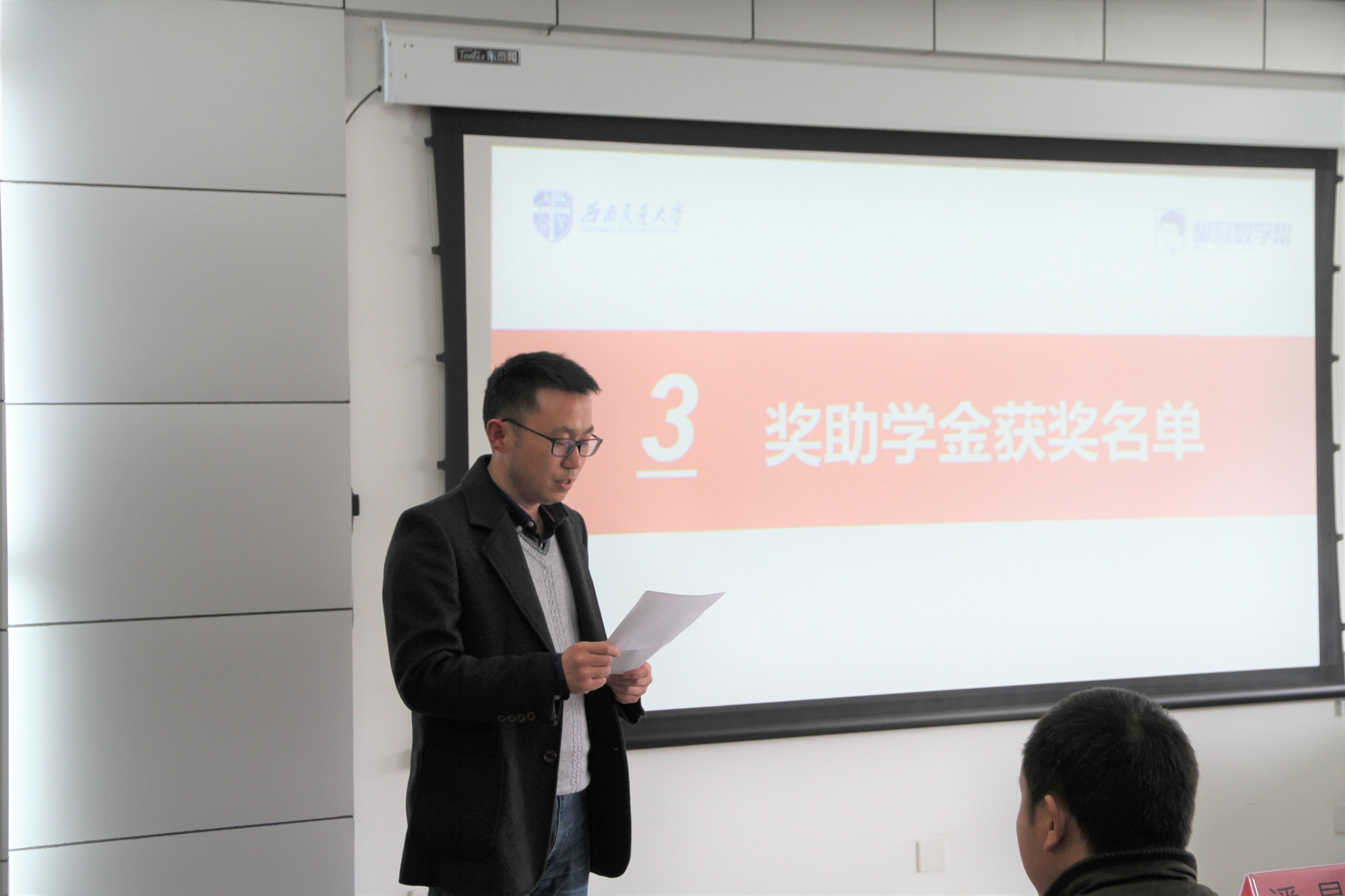 活动伊始,主持人杨育鸿副书记介绍了到场领导来宾,紧接着,杨书记邀请吴小平总经理和潘昱副处长带领助奖学金获得者前去科创工作室进行揭牌仪式。之后,潘小东副院长宣读了2138cc太阳集团2017—2018学年“极客数学帮奖助学金”获奖名单并简单介绍了该奖学金评选的流程,继而由赵晓东总监和杨晗常务副院长为获得该奖助学金的同学们颁奖。