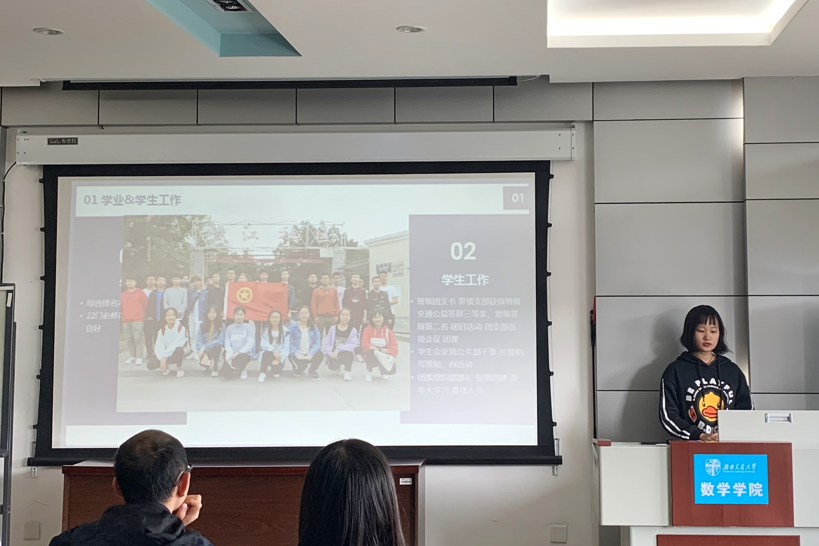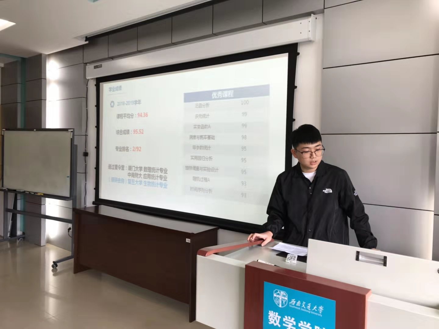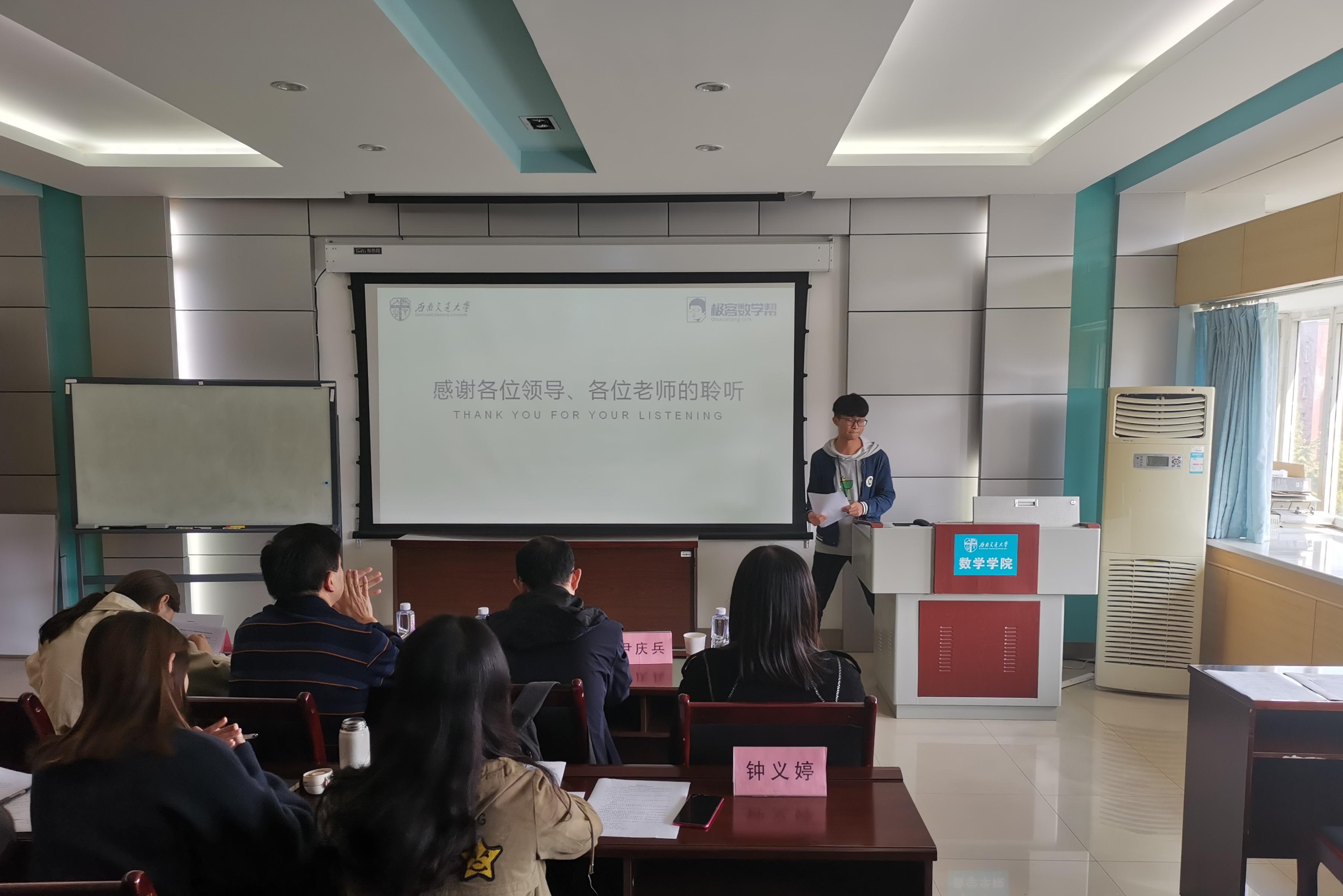 首先进行的是极客数学帮奖学金答辩,答辩者从学习情况,科研竞赛,学生工作,社会实践等方面进行了自我展示,彰显了交大学子突出的综合实力。